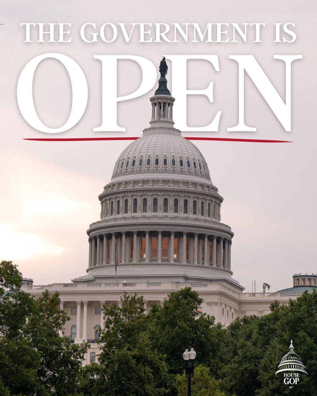 My House and Senate Republican colleagues and I did not cave to the Democrats' radical demands. We held the line. After more than 40 days, the government is back to working on behalf of the American people. I will continue to work alongside President Trump and my Republican colleagues in Congress to deliver the America First agenda.
