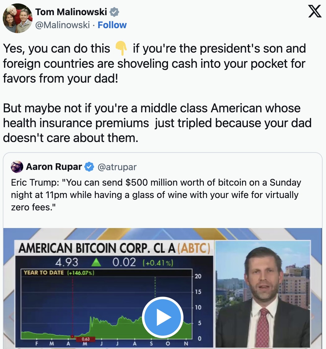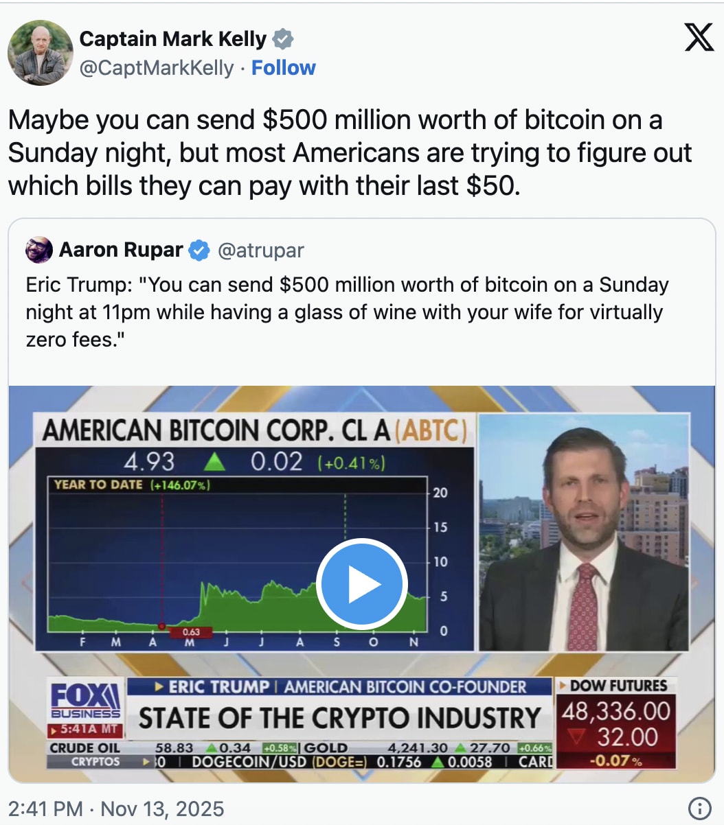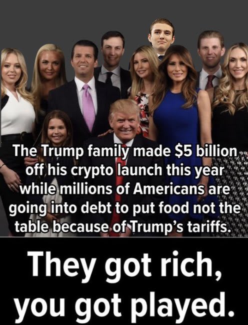 And let’s be honest, haven’t we all found ourselves wondering how to do this over a nice Merlot at 11pm on a Sunday? Yes, the man whose family took a prosperous economy and with a series of the dumbest f*king economic policies this side of Pol Pot. Delivered stagflation that’s starting to spin out of control. He had solid advice for working America. For some reason, it made me think of this: Someone whose daddy—that’d be Don J.—is gifting Argentina’s equally loopy leadership $40 million of our money to bail them out from the very policies Trump’s enacting here, wants you to marvel at the wonders of frictionless billion-dollar transfers. Not food security. Not living wages. Not affordable insulin. Let them inject cake! No, it’s what you’ve always cried out for. Not paid family leave, dumb-dumb. But crypto convenience for all! Because when you’ve never worked a day in your life, money isn’t survival. It’s a parlor trick. Just some fun on a Sunday night for you and your equally inebriated, wholly out-of-touch, fellow dumb-son nepo friends! Future subjects of lawsuits over stolen equity! And of course, nothing would be complete with The Family Trump if there weren’t a con in there somewhere. So of course behind his personal Trumpian word salad—the Caesar with the Russian dressing—sits a scam dressed up as innovation. The family’s sprawling, barely-concealed crypto operation, from the Trump Meme Coin—which in the near future probably gets you a Diet Sprite at the nearest vending machine—to their companies. Such as World Liberty Financial. Together they’ve made the family’s billions, as anyone wishing to buy influence with a family willing to sell it to literally anyone—including inanimate objects—can invest. And don’t forget to buy those Trump sneakers, watches, guitars, and Bibles! Sure, it violates the Constitution’s Emoluments Clause, but who cares! It’s not like John Roberts or Mike Johnson are gonna to anything. 😄 😁 😆 It would be funny if it weren’t so perfectly tragic. A nation where the dopey-ist son of a fake billionaire (pre-crypto scams) turned fake president lectures the struggling masses about how easy it is to move half a billion dollars. While sipping Merlot. This led Senator Mark Kelly to share a few words…a Democratic Senator who didn’t betray us on the government shutdown, and fights to bring about the fall of The House Of Trump: You know, there was a time when Republicans tried to hide corruption and keep the family idiots outta sight. But Eric is the chef’s kiss to Trump’s modus operandi and avatar of our times. Appoint incompetent dilettantes to power. If you’re Trump, you know nobody will stop you. Who cares if they screw up, as long as it lands you money/power/fame/sex. The corporate media sure won’t call you out (don’t wanna be partisan!). And, again, what are John Roberts or Mike Johnson gonna do about it, much less the GOP Senate? In the past, the Billy Carters, the Neil Bushes, the Roger Clintons, America’s political families, used to send these family members to the basement by telling them to fetch some fire wood. Then they lock the door for four to eight years. Keeping them out of sight was crucial. But what do you do when your whole family makes Billy Carter seem like Gary Kasparov? So, Eric Trump may be the dumbest, but nobody else in that family would’ve been allowed in public if they were in any earlier presidential clan. So Eric’s the one they send on air, in front of the cameras and everything, when The Epstein Files are are leaking into a flood, Trump looks like he’s been dead two years and nobody told him, and the American people are losing access to food and doctors. As former New Jersey Democratic Rep. Tom Malnowki put it: Eric, we’ve got you, babe. The very face of American descent. Dumb, decadent, and deeply disconnected. Not the exception to the rule. But it! A system that rewards depravity and punishes competence, kindness and veracity. Look, these people don’t trip into corruption, they wake up every morning and put it on like cologne. Trump Cologne. The Trumps just took things that last step and made our politics a carnival ride for con artists. It’s the gilded ouroboros of American decline. the stupid devouring the sensible, a Fox hit at a time. Eric’s the perfect mascot for the era, where ignorance is lucrative and the shameless rewarded for selling the country by the byte. He’s end-stage-democracy mediocrity and venality. The truth, though, is this isn’t inevitable. The reason Eric Trump can play crypto prophet while the rest of America can’t afford eggs is because we let this circus keep its tent. We let billionaires define success, corporate-media define normal, and corrupt Republicans define “I dare Chuck Schumer to stop me.” The antidote isn’t despair—it’s the bright light of exposure and fury needed to fight these MFers every day. Rip off the gold leaf, my friends, and what you find underneath ain’t genius. Just grift, greed, and a generational habit of chewing on lead-paint chips. What’s the answer? More marches. More election blowouts. More, authentic, charismatic, modern Democrats. More fighting fire with fire (California’s ballot-measure win on redistricting led Indiana to drop their plans to redistrict, a big defeat for Trump). No more Hateful-Eight Democrats And then Eric Trump can go do reverse mortgage ads. Behind bars. Keep Independent Media Loud, Smart, and UnboughtIf you’re sick of watching corporate media treat Eric Trump’s idiocy like economic insight, you’re in the right place. Blue Amp Media isn’t funded by billionaires, hedge funds, or Super PACs — it’s powered by people who want real journalism with a pulse. Every paid subscription keeps this platform independent, fearless, and fully caffeinated for the next fight. 👉 Become a paid subscriber to Blue Amp Media — because the only thing louder tha