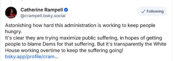 Thank you for being a free subscriber.. Don’t lose access to Lincoln Square. If you upgrade right now, you can lock in 20% off your annual subscription to one of the fastest-growing pro-democracy communities on Substack! Your subscription upgrade helps us inform disengaged voters with the facts to mobilize them into action! Democrats Didn't Cave. They Saved People from Needless Suffering.The Democratic message should be clear: We care about people's pain. Republicans couldn’t care less.“What, WE worry about the people suffering?” My initial reaction to the reports that a sufficient number of Democratic senators had “caved” to the Republicans to bring an end to the government shutdown was, “Not again! What the fuck is wrong with them?” Upon further reflection, I see it a little differently. The fact that the Trump Administration has made it clear that it has no problem with starving Americans, causing them to be unable to have health insurance, and preventing them from joining their families for Thanksgiving, while King Donald I parties like it’s 1928, builds his own Versailles on the grounds of the People’s House, has goons attacking Americans on our own streets, seeks to prevent millions from voting, and collects tribute from billionaires and foreign leaders, made what to do at this point a tough decision. Whichever side of this Democratic decision you think was right, the first imperative is to assure that we do not blame the other group on the Democratic side for what is a wholly-owned Republican catastrophe. Every minute spent attacking other Democrats is, at best, a wasted opportunity and, at worst, shields Republicans from the blame they deserve. I do, though, strongly (as Trump likes to say to hide his weakness) agree with Jay Kuo that if a group of Democrats was “going to move to end the shutdown, they needed to lead with messaging, not explain themselves after the fact. The public needed to hear much more about how the Republicans refused to deal.” They absolutely should have done that. But we are where we are and attacking fellow Democrats as “the surrender caucus” and such is not the way to go. We need to be totally united in pointing to those who are completely to blame for the whole mess: Trump, his administration, and congressional Republicans. Democrats attacking each other will just take public attention away from the real public enemies. If Democrats on both sides of the vote can resist the temptation to fall into their customary infighting and pointing fingers at each other and instead quickly come together and present a united front on where the party—and the broader pro-democracy, pro-America movement stands, the party, democracy, and the American nation will benefit. Here’s the five-point message I suggest: