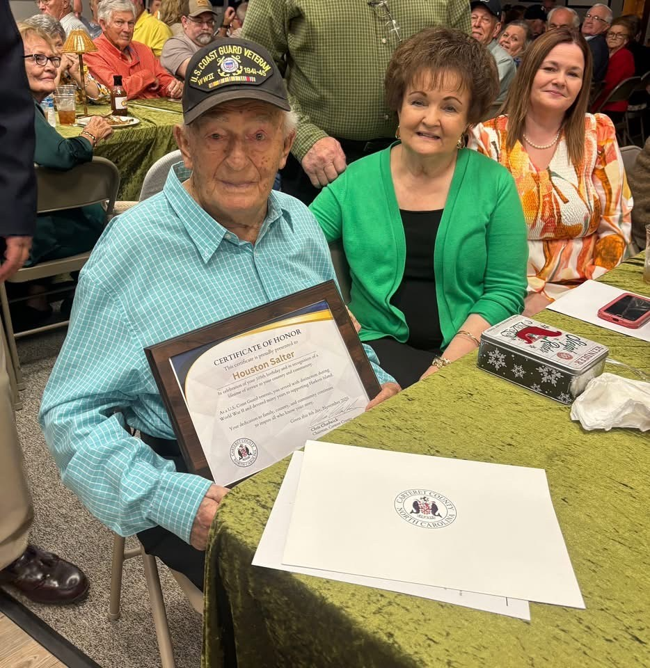 Mr. Salter is the oldest living former member of the US Coast Guard. He enlisted in the United States Coast Guard in 1942 during a critical time. While stationed at Ellis Island from 1942 to 1945, he played an important role in unloading bombs from Coast Guard and merchant ships while also providing port security. He then returned to North Carolina, where he worked at Cherry Point for another 28 years before retiring.