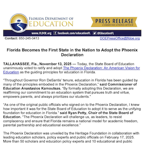 - Last week, Florida’s Board of Education unanimously voted to adopt the Phoenix Declaration as “the guiding principles for education in Florida.” It is the first state to do so.