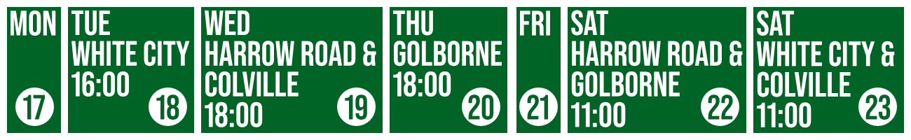 - Wednesday 18:00 - Harrow Road - Maida Hill Market