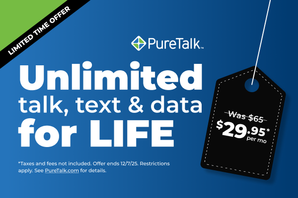 Click HERE to get UNLIMITED talk, text and data for LIFE for just $29.95/mo (reg. $65/mo) when you switch to PureTalk today, all on their crazy fast 5G network! Some restrictions apply. See website for details.