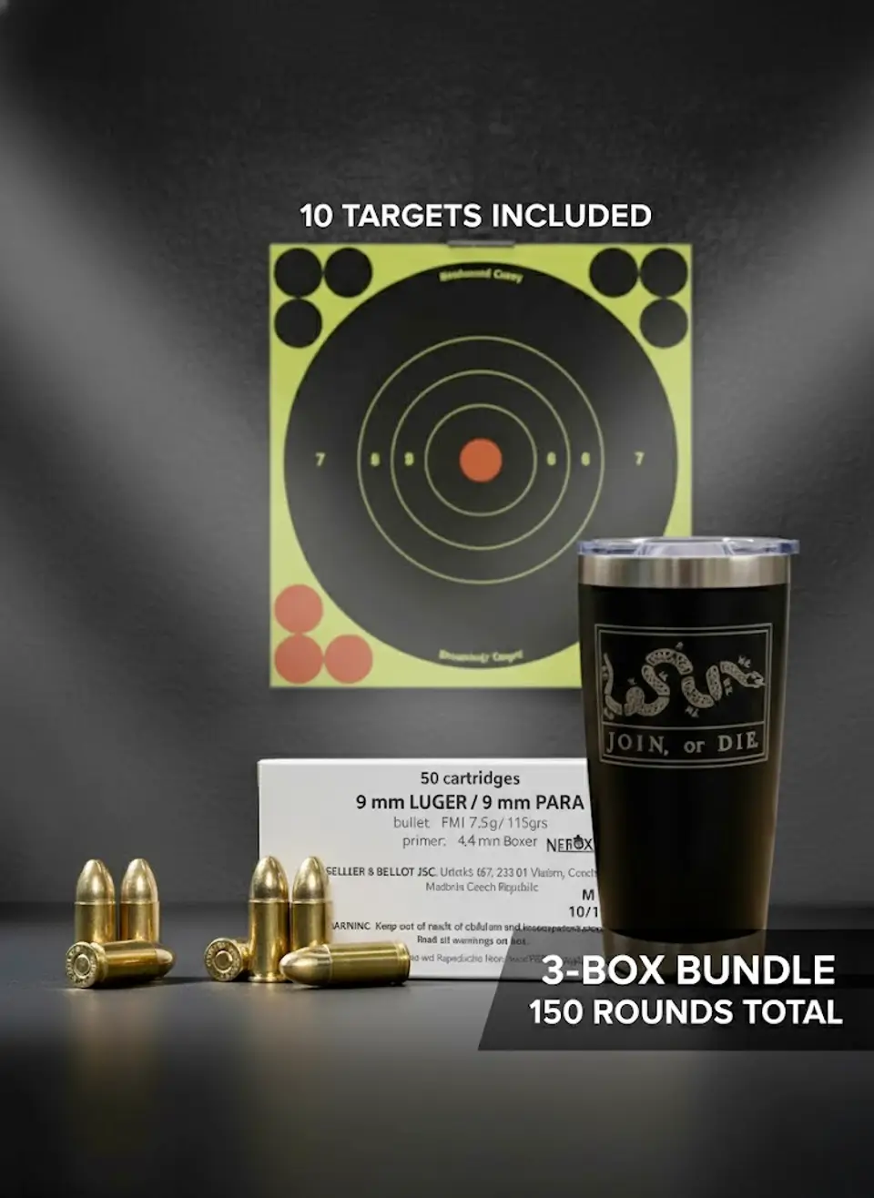 Get A Limited Edition, Hand-Crafted "Join or Die" Tumbler + 9mm FMJ at $0.18/Round |