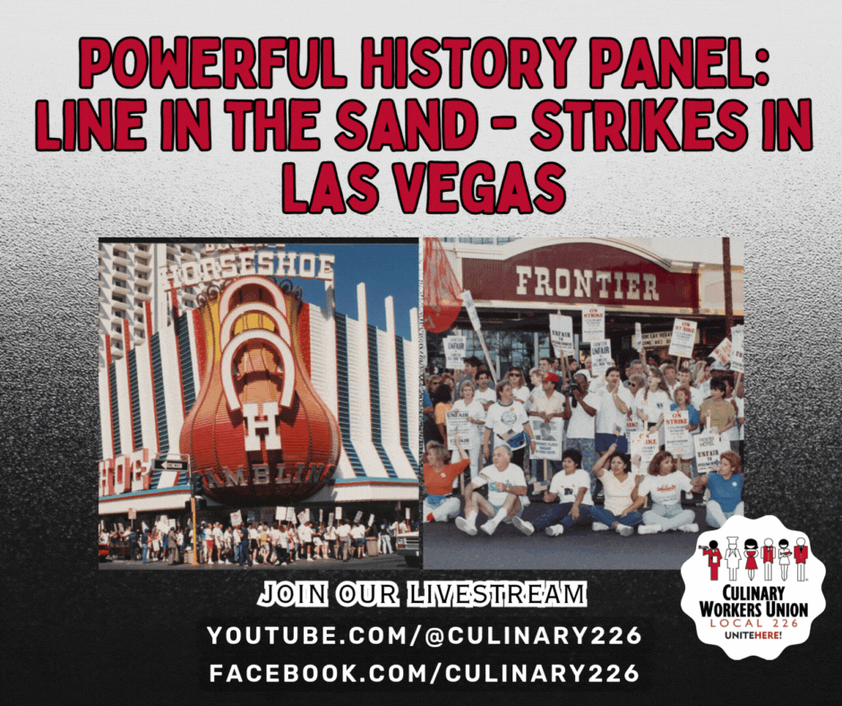 On Thursday, November 20th, 2025 at 6pm, Culinary Union will host a "POWERFUL HISTORY PANEL: Line in the Sand - Strikes in Las Vegas” moderated by D. Taylor, former UNITE HERE President.