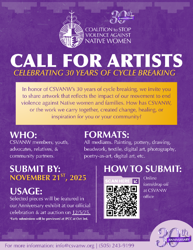 In honor of CSVANW’s 30th Anniversary, we are inviting artists, advocates, youth, and community partners to share artwork that reflects the impact of our collective movement to end violence against Native women and families.