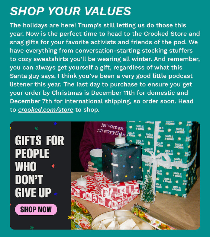 “There’s just no doubt in my mind that that is a quid pro quo in exchange for their investment and favorable treatment to his cryptocurrency,” Murphy added. FILE FIGHTERS… EXTINGUISHED!House Speaker Mike Johnson got beat so badly that even he voted to release the Epstein files today. Here we go! The House nearly unanimously passed a bill calling on Trump’s Department of Justice to release the Epstein files. Only one Republican, Rep. Clay Higgins of Louisiana, voted against the measure, explaining his rationale in a head-scratching rant on X. Hours later, the Senate agreed to pass the bill, too. Now, it’ll be sent off to Donald Trump’s desk for his good ol’ John Hancock — an inevitable ending to this saga… which Trump could have achieved months ago, all by himself. WHAT ELSE?The White House intervened in the federal investigation into alleged sex trafficker Andrew Tate and his brother, ProPublica reports. Trump officials reportedly criticized federal investigators for seizing the brothers’ devices and pushed for them to be returned. Here’s the kicker: The official was Paul Ingrassia, the 30-year-old lawyer with a self-proclaimed “Nazi streak,” who once served as the Tates’ personal lawyer. Federal agents will expand their immigration crackdown to Raleigh, North Carolina, the city’s mayor announced. It’s unclear how large the operation will be, but agents arrested more than 130 people in Charlotte over the weekend, raiding public parking lots and even a church. Trump says a lot of disrespectful crap, but he’s coming under fire for a particularly jarring remark to a female reporter who asked him about the Epstein files. “Quiet, piggy,” he sneered. “Disgusting and completely unacceptable,” CNN’s Jake Tapper tweeted. How much does tech freak Elon Musk really make? It’s nearly impossible to comprehend how much money he has. But the Washington Post created a handy tool, in which you can see how much he makes compared to literally everyone in your occupation. For example: “The 41,550 news analysts, reporters and journalists in America make a combined $4 billion per year, $96 billion less than Musk’s average payment.” “Part of the internet just stopped working,” read a headline from The Independent this morning. That’s basically true: A Cloudflare outage caused sites including X and ChatGPT to shut down for several hours. You know… I think shutting those two sites down occasionally would probably be good for all of us. Can we run this back next week? On that note, even Google’s boss says you shouldn’t “blindly trust” everything AI tells you. “This is why people also use Google search, and we have other products that are more grounded in providing accurate information,” Alphabet CEO Sundar Pichai told the BBC. LIGHT AT THE END OF THE EMAIL…A panel of three federal judges blocked Texas from using its recently-redrawn congressional districts in next year’s midterms. That’s a huge blow to Trump’s agenda: Texas was the first state to redraw to gain more Republican House seats, igniting a nationwide redistricting war. “The public perception of this case is that it’s about politics,” the ruling reads. “But it was much more than just politics. Substantial evidence shows that Texas racially gerrymandered the 2025 Map.” Fraud investigators at Fannie Mae found no evidence that New York Attorney General Letitia James had committed mortgage fraud, despite the Trump administration’s claims, according to court filings. It’s a beautiful thing, watching Trump’s dubious cases against his perceived enemies fall apart. Pope Leo called on the United Nations to take “concrete actions” to fight climate change, saying that God’s creation “is crying out in floods, droughts, storms and relentless heat.” He also took a subtle shot at the Trump administration: “What is failing is the political will of some.” Tell ‘em what you really think, Leo! Instagram promoted its new AI tool by using an image that appears to show Trump kneeling before a satanic demon. A Meta spokesperson said that the “user-generated content … has been removed from this recommendation surface as it violated our protocols for promotions.” It’s unclear how that image came to be used in the promotion, but props to The Daily Wire for catching this one. I never thought I’d give Ben Shapiro’s media company props in my life, but we live in strange times. An Australian prisoner is challenging a ban on eating vegemite while locked up, saying that it’s his “human right” to consume the bitter spread, which basically tastes like eating a bouillon cube. This is one human right I don’t think I want. You’re currently a free subscriber to Crooked Media. For the full experience, upgrade your subscription. |