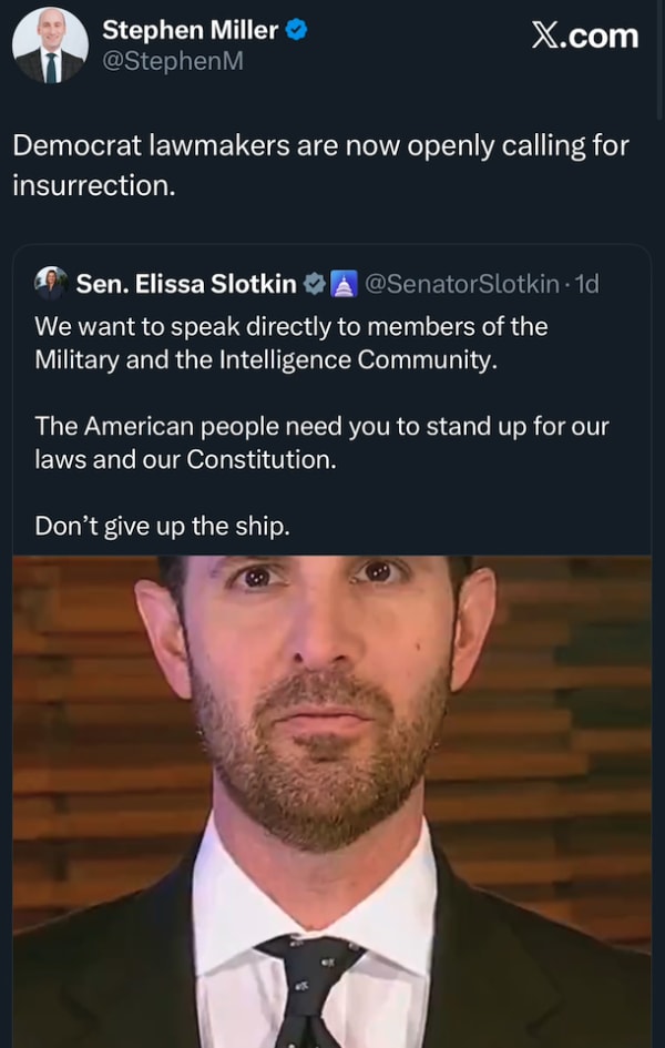 Let’s be clear about this: A man dedicated to the weaponization of the federal government and the domestic deployment of our troops is panicking because the concept of lawful orders is being discussed openly. And his solution is to call this an insurrection while ignoring the fact that his boss incited an ACTUAL insurrection that killed multiple people and injured dozens.