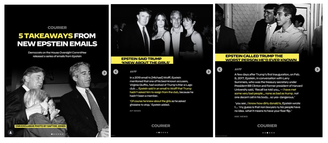 Hi all! As always, thanks for being a member of our ROUNDUP community. I wanted to personally invite you to join COURIER on December 11 in Washington, D.C. for an end-of-the year soirée uplifting some of our nation’s key voices of resistance. - Charlotte Robertson P.S. If you haven't already, give us a follow on social (like and subscribe to our YouTube, Instagram, TikTok, Bluesky, Threads, and X/Twitter) to make sure you don't miss anything. How Mamdani turned 45,000 social media clicks into a real-life army of volunteersHow did NYC Mayor-elect Zohran Mamdani take his online success and turn it into tangible supporter action? The digital strategist behind his chatbot infrastructure, Gabriella Zutrau, breaks it down for COURIER’s FWIW. We created a searchable database with all 20,000 files from Epstein’s EstateHave you seen COURIER’s viral new database? It’s an easy way for you to search all 20,000 of the files just released from Epstein’s estate. National correspondent Camaron Stevenson explains more in Below the Beltway. Celebrate the Court’s rejection of Kim Davis — But don’t let your guard down“We are not out of the woods. In fact, we are deep in the forest on a long, dark night, and marriage equality still remains at real risk,” writes Lisa Graves for Grave Injustice in her examination of the Court’s real motives. Advertise in the newsletterDo you or your company want to support COURIER’s mission and showcase your products or services to an aligned audience of 190,000+ subscribers at the same time? Contact [email protected] for more information. On COURIER's TikTok, you can see the top post of the week here with 7.1+ million views and 797,000+ likes. On COURIER's Instagram, you can see the top post of the week here with 2.9+ million views and 46,000+ likes. Epstein survivors just released this gutting new videoThe anti-trafficking group World Without Exploitation released a video PSA featuring a group of Epstein survivors advocating for the release of all Epstein files. COURIER shared the viral video across platforms. 5 takeaways from the new Epstein emailsOversight Democrats in the U.S. House released 20,000 pages of Epstein documents. COURIER combed through the emails and shared 5 major takeaways you don’t want to miss. MAGA supporter defends child sexual abuse in disturbing debateA viral clip shows a MAGA supporter defending child sexual abuse during online political commentator Dean Withers’ recent livestream. COURIER shared the disturbing clip. Advertise in this newsletterDo you or your company want to support COURIER’s mission and showcase your products or services to an aligned audience of 190,000+ subscribers at the same time? Contact [email protected] for more information. As Border Patrol arrives in Raleigh, advocates offer warnings and guidanceCOURIER’s Cardinal and Pine looks at Border Patrol’s push into Raleigh and gives guidance on what North Carolinians can and can’t do legally if confronted by federal agents. Virginia can raise billions with new taxes on millionaires, report findsThe income of a public school teacher in Virginia is currently taxed at the same rate as the income of a millionaire business executive. COURIER’s Virginia outlet, Dogwood, peels back the curtain. Shutdown deal means Iowa hemp industry could go up in flames“Tucked away inside a bill to reopen the federal government … is a provision that would redefine the federal definition of hemp,” writes Ty Rushing for COURIER’s Iowa Starting Line. |