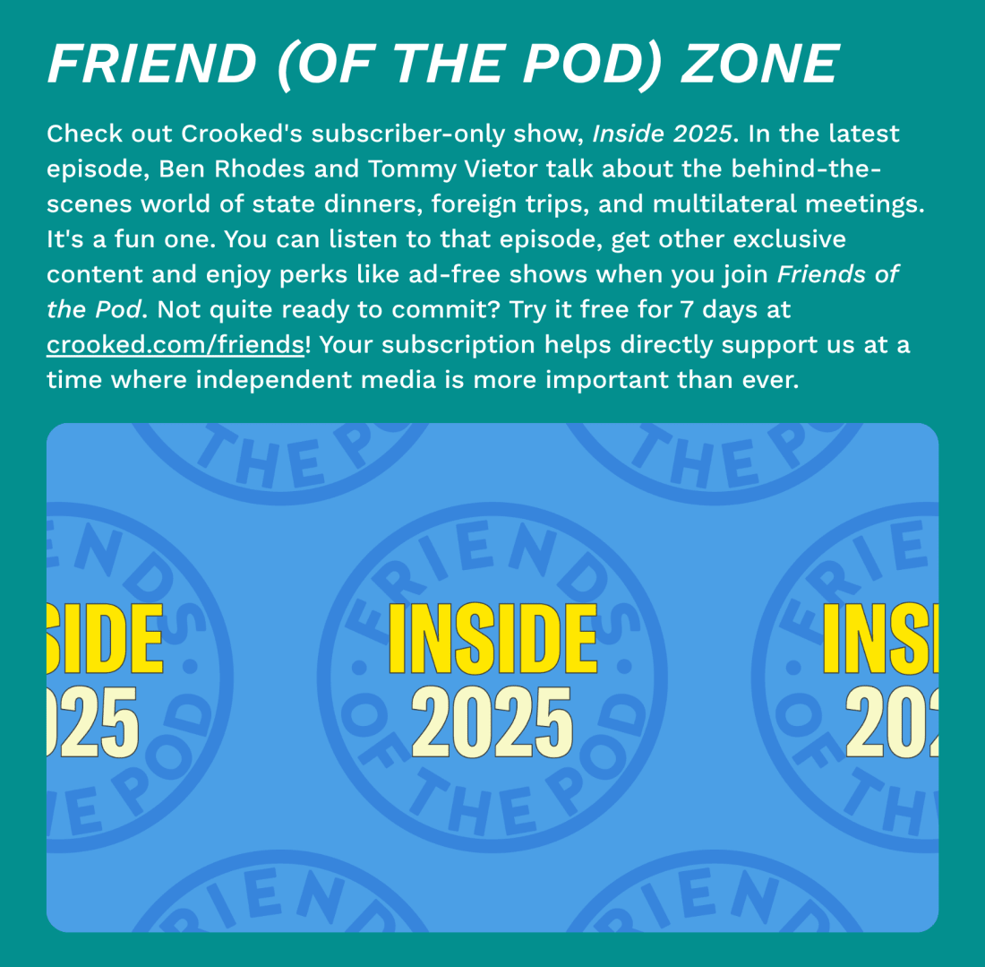 Can the former “First Buddy” buy his title back? I have a feeling we’ll know sooner rather than later. WHAT ELSE?A federal judge took Trump admin prosecutors to the woodshed today over their controversial case against former FBI Director James Comey, in a hearing described by the New York Times as “excruciatingly awkward.” Lindsey Halligan, Trump’s hand-picked U.S. Attorney, admitted she never showed the final version of Comey’s indictment to the full grand jury before it was signed. “The spectacle, which played out over nearly 90 minutes of tense courtroom colloquy, drove home just how slapdash the prosecution of Mr. Comey appeared to have been from its inception,” the Times writes. The judge “could now have more reasons to throw out the charges.” A Capitol rioter pardoned by Donald Trump was recently accused of sex crimes against two children, The Intercept reports. According to a police report, the man, Andrew Johnson, floated the idea of giving one of the victims money from a supposed $10 million that he claimed to be entitled to as part of his January 6 arrest. Johnson, who pleaded not guilty, allegedly intended to prevent the child from “exposing what Andrew had done,” police believe. Care to comment, Mr. President? More than 600 Americans were fired, suspended, or faced other disciplinary actions at work after making public comments about right-wing influencer Charlie Kirk’s assassination, according to a Reuters investigation. There are “very disturbing parallels” to the 1950s anti-Communist purge, University of Iowa History Professor Landon Storrs told the outlet. Trump’s attacks on climate science could lead to the release of extra greenhouse gases over the next decade — causing the death of 1.3 million people from temperature-related causes worldwide within a century, according to a ProPublica and Guardian analysis. Countries that would be most affected, primarily in South Asia and Africa, “emitted relatively little of the pollution that causes climate change — and are least prepared to cope with the increasing heat,” the outlets report. The Trump administration is drafting a new plan to end Russia’s war in Ukraine, Axios reports. Special envoy Steve Witkoff is reportedly crafting the deal and has discussed it with top Russian officials. “We feel the Russian position is really being heard,” Russian envoy Kirill Dmitriev told the outlet. After the story’s publication, Wikoff tweeted what seemed intended to be a private message: “He must have gotten this from K,” he wrote, likely referring to Dmitriev. Only the brightest! LIGHT AT THE END OF THE EMAIL…Did you miss our big, cool, very fun conference in Washington D.C., Crooked Con? This writeup in Slate provides a superb rundown of events: “If we are to believe the party has grown too blinkered and conflict-averse — allergic to its own inherent fringes and eccentricities — then Crooked Con serves as a kind of shock therapy.” Donald Trump’s media and crypto company’s stock price has plummeted, incinerating $5 billion worth of his family’s wealth. Bitcoin is trading at a seven-month low, so this is a good time to remind you: Crypto is highly volatile. Buyer beware! The House will vote on repealing a provision that would allow GOP senators to sue for $500,000 over a Biden-era probe involving their phone records. The measure, spearheaded by Majority Leader John Thune, was so unpopular even among Republican lawmakers lashed out. “It is beside my comprehension that this got put in the bill, and it’s why people have such a low opinion of this town,” Rep. Chip Roy (R-TX) told CBS News. Gov. JB Pritzker (D-IL) gifted Pope Leo a six-pack of local beers named “Da Pope.” In response, Leo said: “We’ll put these in the fridge.” I didn’t know I could like this guy even more. Today is World Toilet Day! The bizarrely named observance aims to raise awareness of the estimated 3.4 million people who don’t have access to clean sanitation, and some 300 million people who don’t have access to private bathrooms. As for the day’s namesake: “It walks the line between not being offensive and being fun,” UNICEF sanitation chief Ann Thomas told NPR. Tennis legend Roger Federer was elected to the Tennis National Hall of Fame today, the first time he was eligible for the honor. As the Associated Press put it: “Well, this will come as no surprise to anyone who’s paid any attention over the past quarter-century.” Curaçao officially became the smallest country to earn a spot in the World Cup. The autonomous territory has only 156,000 residents, nearly 200,000 less than Iceland, which previously held the record. I don’t care if their chances are low, I am putting all my money on them right now. (Y’know, figuratively — I don’t bet on sports.) Go Curaçao! Engineers are tapping into an active Oregon volcano, which will be used to generate geothermal power for homes nearby as soon as next year. Less than 1 percent of electricity worldwide is produced by geothermal energy, but experts believe it could be an effective way to drive down costs via clean energy. Farmers thought of an ingenious way to offset falling dairy prices: Charge people to cuddle the cows. “It’s a bit like a cow’s spa day, really,” one farmer told the Washington Post. “They just sprawl out while people are stroking them and cuddling them.” You’re currently a free subscriber to Crooked Media. For the full experience, upgrade your subscription. |