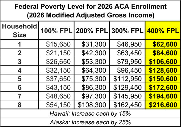 … while D.C., Minnesota, New York and Oregon all have their Basic Health Plan (BHP) programs for enrollees who earn less than twice the Federal Poverty Level. Again, you can read details about each of these in my enrollment guide. Finally, if you earn more than four times the Federal Poverty Level (FPL) and will therefore not be eligible for federal tax credits in 2026, I mentioned last time that I’d provide more details about ways you can legally get your Modified Adjusted Gross Income (MAGI) below that critical 400% FPL threshold. As a quick reminder, here’s what 400% FPL will be in 2026 for every state (note the caveats re. Hawaii and Alaska): Here’s the basics; full credit to my friend and colleague Louise Norris for this info: