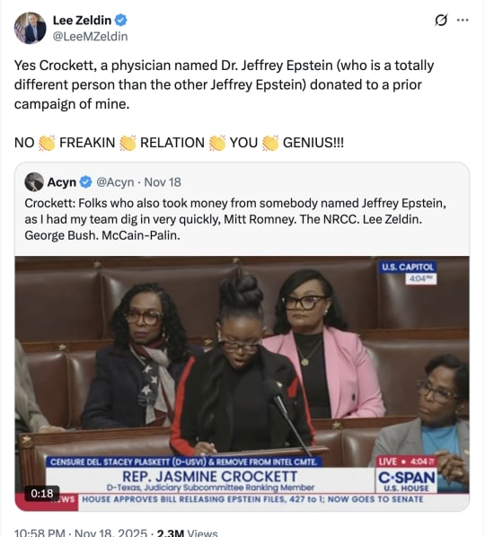 Widespread criticism of Crockett’s defense: Critics including CNN pundit Scott Jennings called Crockett “literally the perfect modern Democrat,” while Washington Free Beacon reporter Chuck Ross noted “it took me 2 minutes to figure it out,” former CNN commentator Chris Cillizza asked “Why can no one say ‘I was wrong and I am sorry’ anymore?”, and Rep. Mike Lawler (R-NY) called the exchange “an embarrassment to this institution on every level.”
