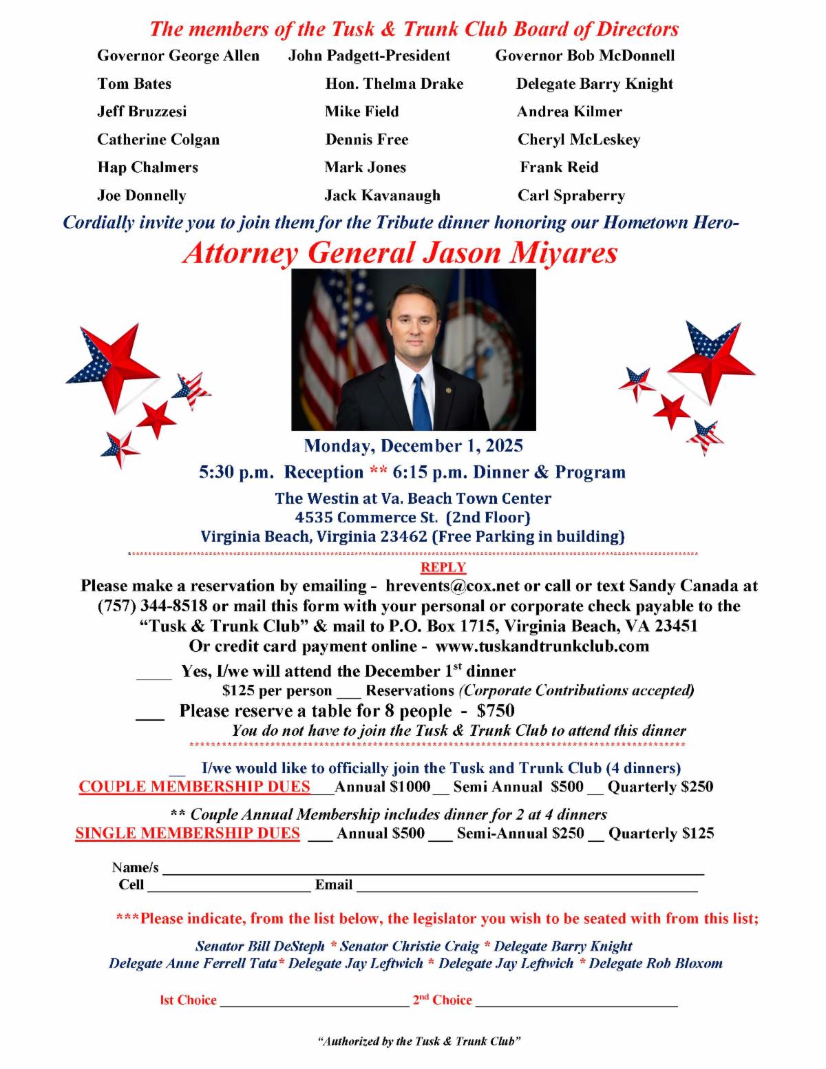 I want to share an important message from the Tusk & Trunk Board of Directors and personally encourage you to join us for a very special evening, honoring Virginia's Attorney General, Jason Miyares on Monday, December 1, 2025.