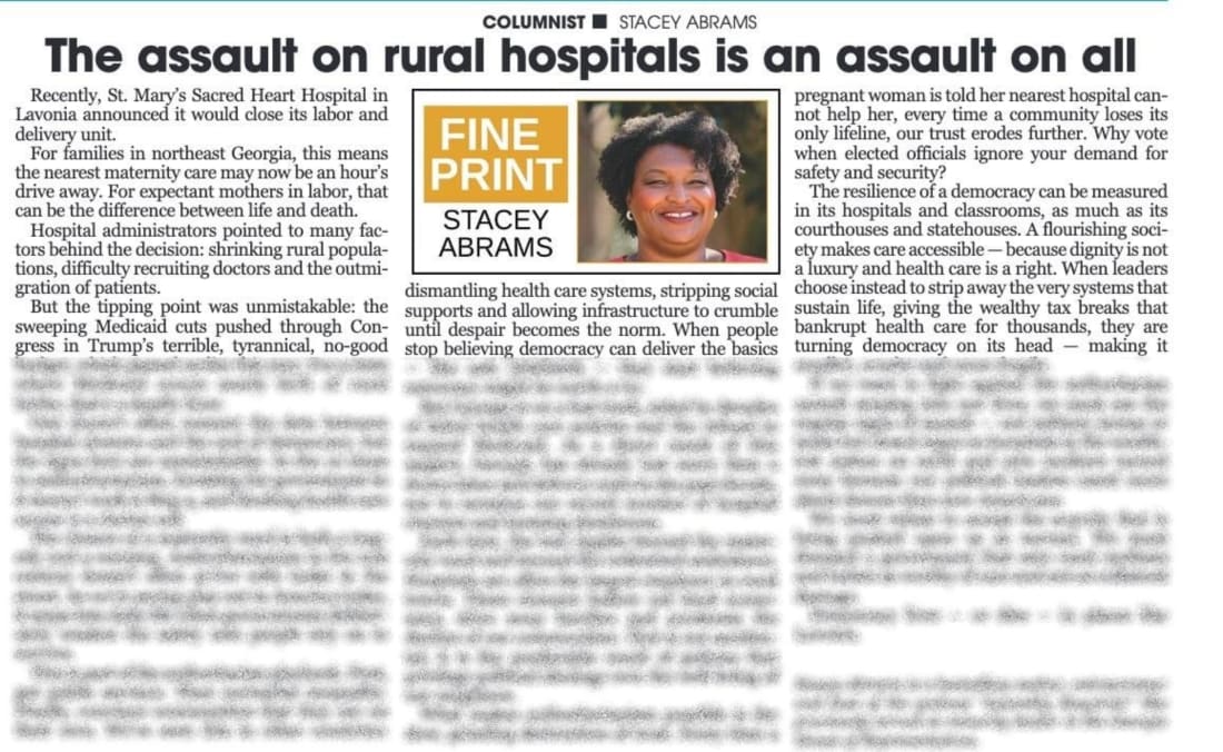 A Few Things Worth Your Time This WeekI talked with Joyce Vance about the road out of this mess, and rounded up a few other things you should know this week.I had an energizing conversation earlier today with Joyce Vance about how we fight authoritarianism head-on, and what it will take to get ourselves out of the crisis we’re living through. Joyce’s new book, Giving Up Is Unforgivable, makes it clear: this isn’t abstract. It’s about real people, real communities, and real consequences. If you weren’t able to tune in, you can watch the recording of our conversation now. This week on our Assembly Required PodcastWe’re joined by Dan Pfeiffer to break down what the redistricting war means for democracy, why it’s a fight for survival, and what it reveals about the Democratic Party’s future. My latest Fine Print column: The assault on rural hospitals is an assault on allAcross the country, rural hospitals are shutting their doors, leaving entire communities without emergency rooms, maternity care, or even basic health services. Behind every closure is a family forced to drive hours for treatment, a local nurse pushed out of the job she loves, a town losing one of its last remaining anchors. Nowhere is this more evident than here in Georgia. In my latest Fine Print column for the Georgia Trust for Local News (GTLN), I talk about the closure of the labor and delivery unit at St. Mary’s Sacred Heart Hospital in Lavonia, how Trump’s Medicaid cuts are accelerating these closures, and what it will take for us to put a stop to this cruelty. This is a crisis made by decisions—it’s up to us to stop it. You're currently a free subscriber to Assembly Notes by Stacey Abrams. For the full experience, upgrade your subscription. |