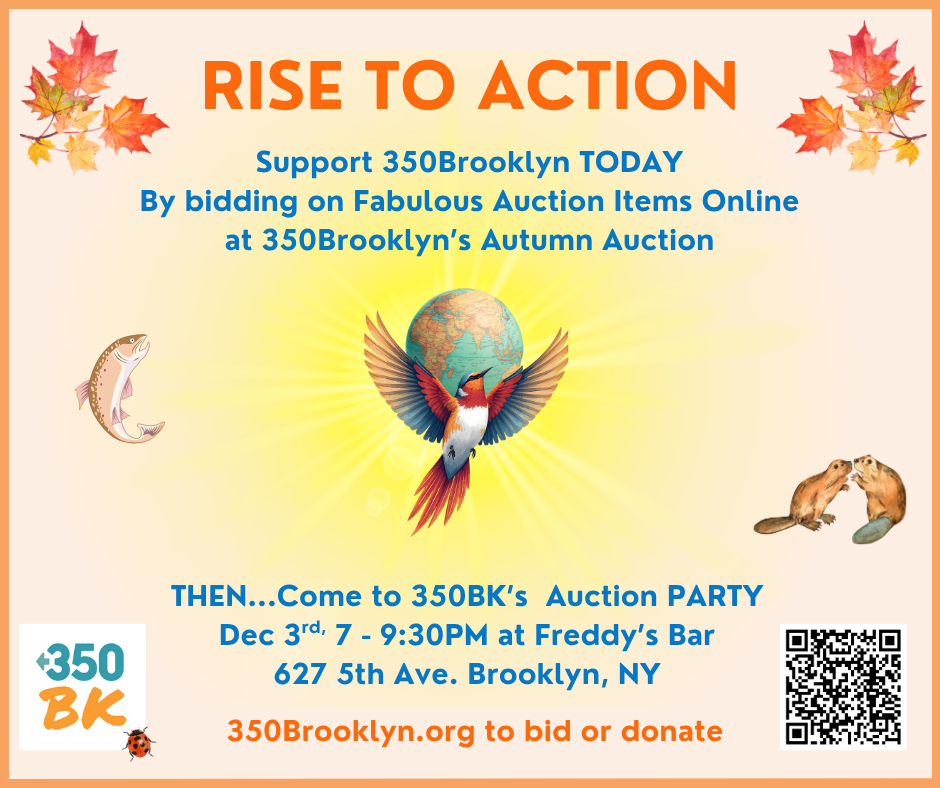 Join us on December 3rd from 7 - 9:30 PM at Freddy's Bar in Park Slope for our End of Year Auction PARTY. Place your final bids, eat, drink and sing with all your 350 Brooklyn activist buddies! RSVP HERE. Most of the items will be at the party for you to pick up if you are the winning bidder, but you do not have to be present to win.