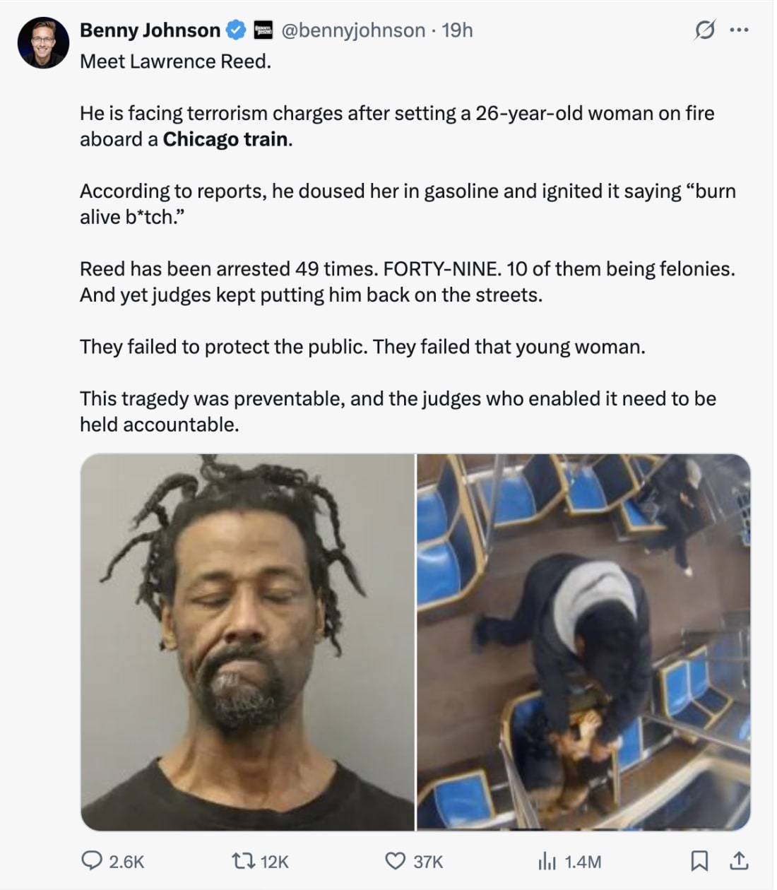 Career criminal had “no business being on the streets.” Reed has been arrested by Chicago police at least 13 times since 2017 on charges including aggravated arson and multiple batteries, and in August was released with an ankle monitor after allegedly assaulting a woman at a psychiatric hospital despite prosecutors requesting detention, prompting ATF Special Agent Chris Amon to say Reed “had plenty of second chances” that resulted in an innocent victim fighting for her life.