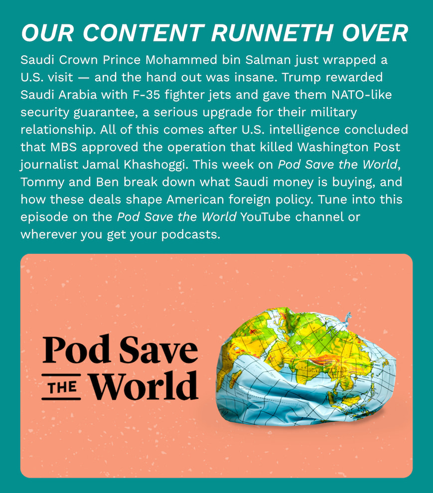 As for the Trump administration’s authoritarian actions in the U.S. and abroad: “None of this is normal. None of this is acceptable in the United States of America,” Crow said. “I will never, ever stop speaking out against it.” BIG (OH) BROTHERDo you drive a car? You might wanna keep an eye out for Border Patrol. Border Patrol agents are quietly surveilling drivers across the United States, detaining people deemed to have “suspicious” travel patterns, according to the Associated Press. The agency uses an algorithm embedded in a network of cameras to scan millions of license plates and where they came from, the outlet reports. “Suddenly, drivers find themselves pulled over — often for reasons cited such as speeding, failure to signal, the wrong window tint or even a dangling air freshener blocking the view,” the AP writes. “They are then aggressively questioned and searched, with no inkling that the roads they drove put them on law enforcement’s radar.” The program, which started years ago to police border areas, has reportedly expanded into the country’s interior over the past five years. The Trump administration is poised to provide Border Patrol with an additional $2.7 billion to build out the mass surveillance network. “They are collecting mass amounts of information about who people are, where they go, what they do, and who they know,” Nicole Ozer, executive director of the Center for Constitutional Democracy at UC Law San Francisco, told the AP. “These surveillance systems do not make communities safer.” WHAT ELSE?Donald Trump officially signed the bill to release the Epstein files — but it’s worth remembering this bill contains some serious loopholes. For example: Trump’s Department of Justice now has one month to release the files… EXCEPT those related to ongoing investigations. Remember how the DOJ opened up a brand new criminal investigation focused exclusively on Epstein’s connections to Democrats? Yeah. Watch that space. The Coast Guard will stop classifying swastikas and nooses as hate symbols, downgrading them to be merely “potentially divisive,” the Washington Post reported, citing internal documents. Officials who spoke to the paper said they disagreed with its reporting on this subject, although their objections were vague, and it doesn’t seem the paper actually misreported the new policy. Still, the Department of Homeland Security later tweeted: “Y’all are just making things up now. 💀” The CDC changed its website to claim that vaccines may cause autism, a conspiracy theory without scientific backing. This is a stark example of anti-vaxxer HHS Secretary Robert F. Kennedy’s influence: During a hearing in February, Kennedy promised Sen. Bill Cassidy (R-LA) that he would “not remove statements on their website pointing out that vaccines do not cause autism” if confirmed for the job. Could we just go back to talking about RFK Jr.’s weird love life, please? The unemployment rate reached its highest level in four years in September, according to delayed Labor Department statistics. That reflects a “low-hire environment where it has been difficult for those workers who are laid off to find work again,” the Wall Street Journal writes. However, some 119,000 were hired that month, beating expectations. The Trump administration announced new plans to drill for oil off the California and Florida coasts, the first such projects in decades. Rep. Rob Bresnahan (R-PA) reportedly sold up to $130,000 worth of stock in multiple Medicaid providers before voting for seismic cuts to the program. While Bresnahan says he never told his financial advisers what to buy or sell, the revelation comes at a bad time for stock traders on Capitol Hill: Lawmakers are considering whether the practice should be allowed for members of Congress. “This body has been enriching itself on the taxpayers’ dime for too daggum long, and it’s got to stop. This place is as crooked as a dog’s leg,” Rep. Tim Burchett (R-TN) told reporters. A lot of folks think that’s daggum right. Political leaders gathered for former Vice President Dick Cheney’s funeral today, which Trump and Vice President JD Vance were reportedly not invited to. “If anybody needed more evidence of how politics have changed in America: Rachel Maddow is at Dick Cheney’s funeral,” the New York Times’s Peter Baker tweeted. Electric car sales surged to $32 billion last quarter, a 32 percent jump from the previous quarter. Why? Federal tax credits to buy electric vehicles, implemented during the Biden administration, expired at the end of September — prompting buyers to rush in. A former GOP congressional aide allegedly staged her own violent attack in July, according to federal prosecutors. The details are bizarre: Natalie Greene, who worked for Rep. Jeff Van Drew (R-NJ) allegedly paid a scarification artist $500 to cut her, scrawling “TRUMP WHORE” and “Van Drew is a racist” into her skin. She was found zip-tied in the woods by police, who allegedly found security footage of her buying the zip-ties. She also allegedly claimed attackers had threatened to shoot her. “Our thoughts and prayers are with her and hope she’s getting the care she needs,” Van Drew’s office said in a statement. LIGHT AT THE END OF THE EMAIL…Trump’s deployment of National Guard troops to Washington, D.C. was illegal, a federal judge ruled today. As a D.C. resident, you can trust me when I say: No one wants to be out of this city more than those troops. They are so bored and doing absolutely nothing. Trump’s case against former FBI Director James Comey “is dead,” former Trump White House lawyer Ty Cobb predicted to NBC News. His sober analysis comes after the Department of Justice admitted that interim U.S. Attorney Lindsey Halligan didn’t show the full grand jury Comey’s indictment. “Both Halligan and [Attorney General Pam] Bondi should be disbarred,” he a
