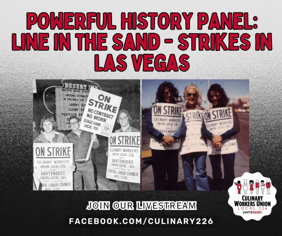On TODAY, November 20th, 2025 at 6pm, Culinary Union will host a "POWERFUL HISTORY PANEL: Line in the Sand - Strikes in Las Vegas” moderated by D. Taylor, former UNITE HERE President.