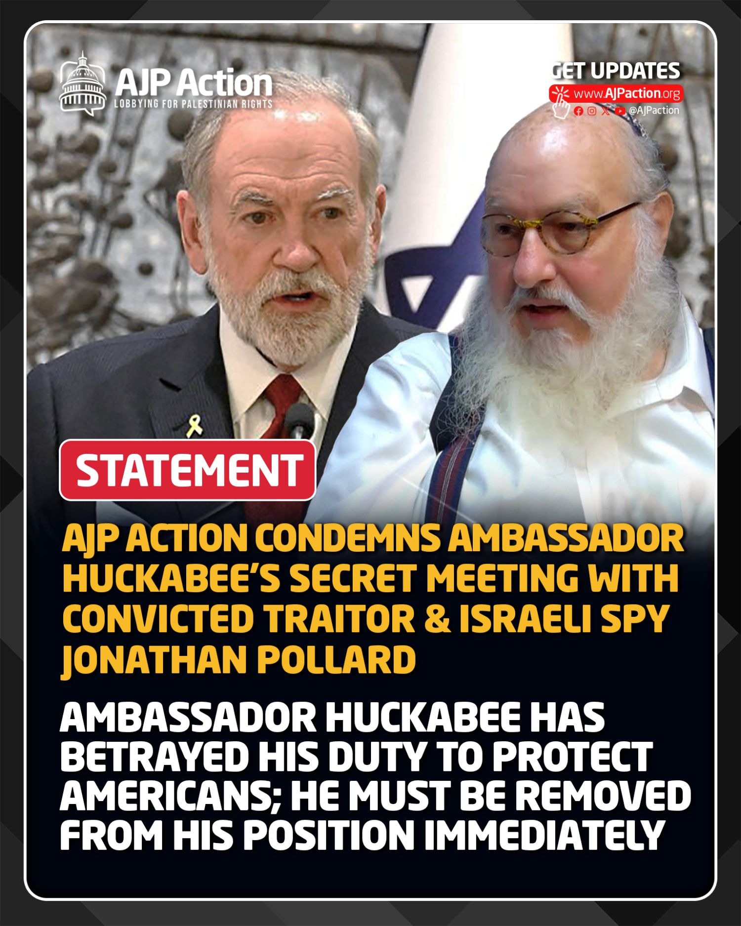 Ambassador Huckabee has betrayed his duty to protect Americans; he must be removed from his position immediately Dear Email, Ambassador Mike Huckabee’s recent secret meeting with convicted traitor and Israeli spy Jonathan Pollard is a profound betrayal of the United States and the office he is supposed to hold. Pollard is a former U.S. intelligence analyst who sold American secrets to a foreign government, spying against his own country for cash and gifts. By embracing this spy within the walls of the U.S. Embassy in Jerusalem, and without any transparency with the American people, Huckabee has disgraced his post and insulted every American. For context: in 1987, Pollard was sentenced to life in prison for violations of the Espionage Act. Successive U.S. officials from both political parties, as well as leaders within the defense and intelligence communities, consistently opposed any form of clemency. They maintained that the damage Pollard inflicted on U.S. national security through his espionage was far more severe, wide-ranging, and enduring than publicly acknowledged. Pollard was released from prison on November 20, 2015, in accordance with federal sentencing guidelines. Five years later, on November 20, 2020, his parole expired, lifting all remaining restrictions. Shortly after, on December 30, 2020, Pollard and his second wife relocated to Israel, settling in Jerusalem. Since moving to Israel, Pollard has publicly aligned himself with far-right political figures, including Minister Itamar Ben-Gvir. He has also advocated for extreme measures, such as the forced population transfer of Palestinians from Gaza to Ireland. Huckabee’s meeting with traitor Pollard presents a grave question: whom does Mike Huckabee represent? Is he the U.S. Ambassador to Israel, or is he a representative of Israeli interests embedded deep within the American establishment? His actions consistently suggest the latter. He has actively lobbied a U.S. President to enter a foreign war, recklessly endangering American lives and regional stability within the Middle East for the benefit of another nation, which is Israel. In a breach of diplomatic protocol, he wrote a message to President Trump in June framing an attack on Iran as an act of "divine providence," openly urging a conflict that would serve Israeli, not American, interests. Furthermore, he is a vocal proponent of Israel's illegal annexation of the West Bank, deliberately using the term "Judea and Samaria" to signal his endorsement of an expansionist agenda that directly undermines official U.S. policy and international law. Meanwhile, Huckabee has neglected his most fundamental duty: to protect American citizens. While he fraternizes with a traitor, American citizens like Mohammad Ibrahim (16 years old) have been left to deteriorate in Israeli prisons for nearly ten months without due process. This was followed by Israeli soldiers shooting and killing a 14-year-old Palestinian-American teenager, Amer Rabee, in the West Bank town of Turmus Ayya in April. No justice has been granted to Amer’s family. Huckabee also offered no meaningful justice or accountability for Mohammed's cousin, Sayfollah Musallet, also an American citizen, who was murdered by Israeli settlers this past July. Justice has been denied in both cases, and Mohammad remains imprisoned despite reports of his declining health and the documented abuses within the Israeli detention system. These victims represent a brutal pattern of American citizens being killed and detained by a foreign entity with zero accountability. An ambassador's primary duty is to be their shield; Huckabee has instead been an accomplice to their suffering. There is something profoundly corrupt about an administration that consistently aligns itself with, enables, and protects criminals, from convicted traitors like Pollard to the Israeli state and settler forces who kill and imprison Americans with impunity. Mike Huckabee has demonstrated that he is unfit to serve as a representative of the United States. His conduct is an insult to our nation's security and its citizens. He must be removed from his position immediately and expelled from his post. A valid "America First" policy means putting American interests and American citizens first. It cannot be a hollow slogan used to mask an "Israel First" agenda that excuses the embrace of traitors and abandons our own people to injustice. Huckabee’s actions are not just an embarrassment; they are a subversion of American sovereignty, and they must end now. In solidarity, Americans for Justice in Palestine Action |