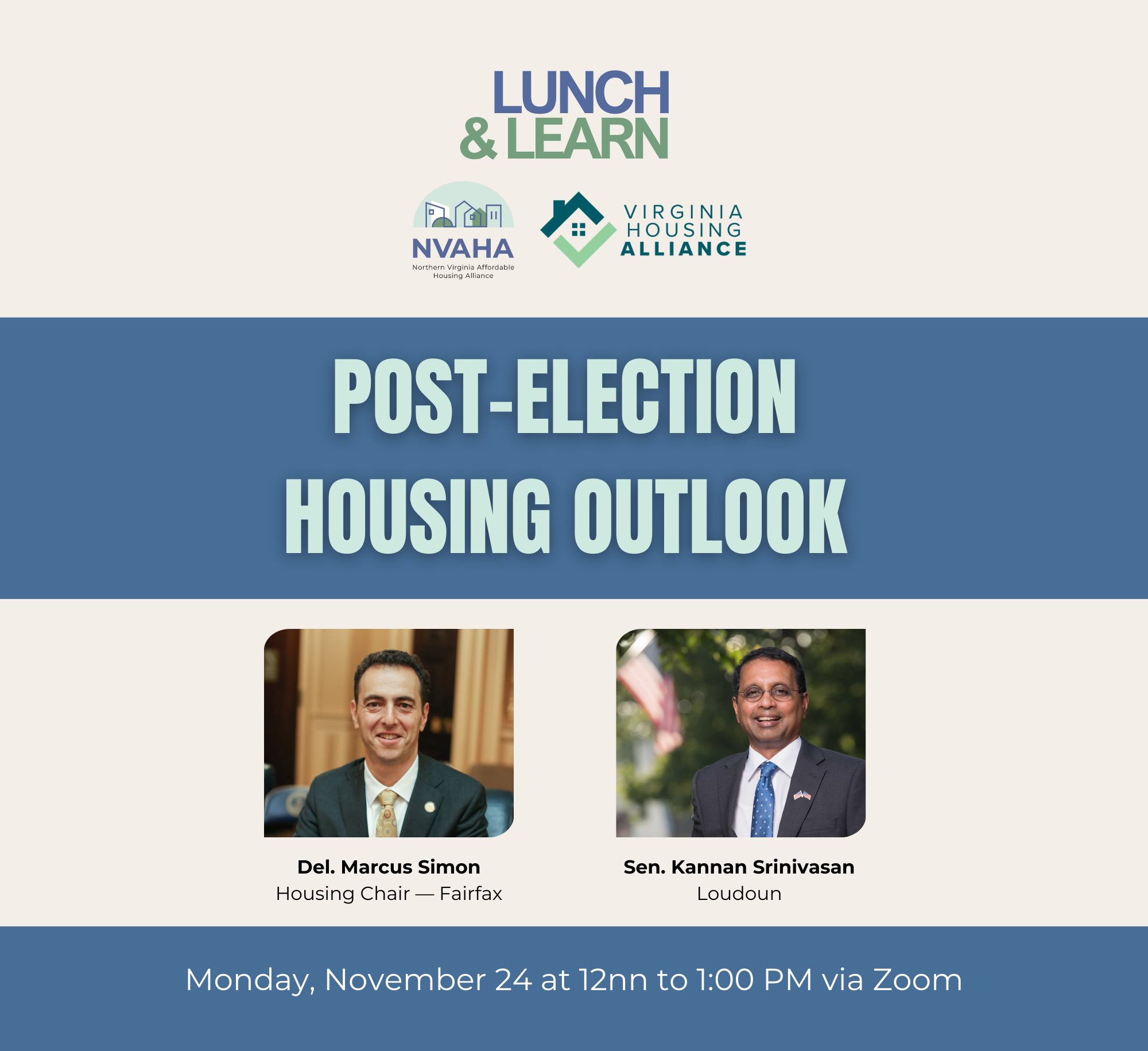 We’re looking forward to our next Lunch & Learn on Monday, November 24, hosted in partnership with the Virginia Housing Alliance. This session will run from 12:00 to 1:00 PM and will feature Del. Marcus Simon and Sen. Kannan Srinivasan, along with VHA, sharing their perspectives on what may take shape for housing in the 2026 General Assembly.
