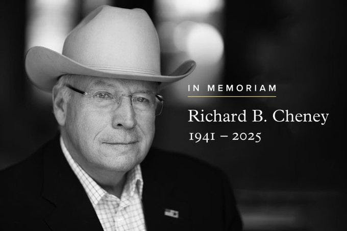 This week, we join many in mourning the loss of the great American patriot Dick Cheney, who served faithfully as a Congressman, Secretary of Defense, and Vice President. His influence as a statesman was profound, and his legacy of strength and leadership will not soon be forgotten.
