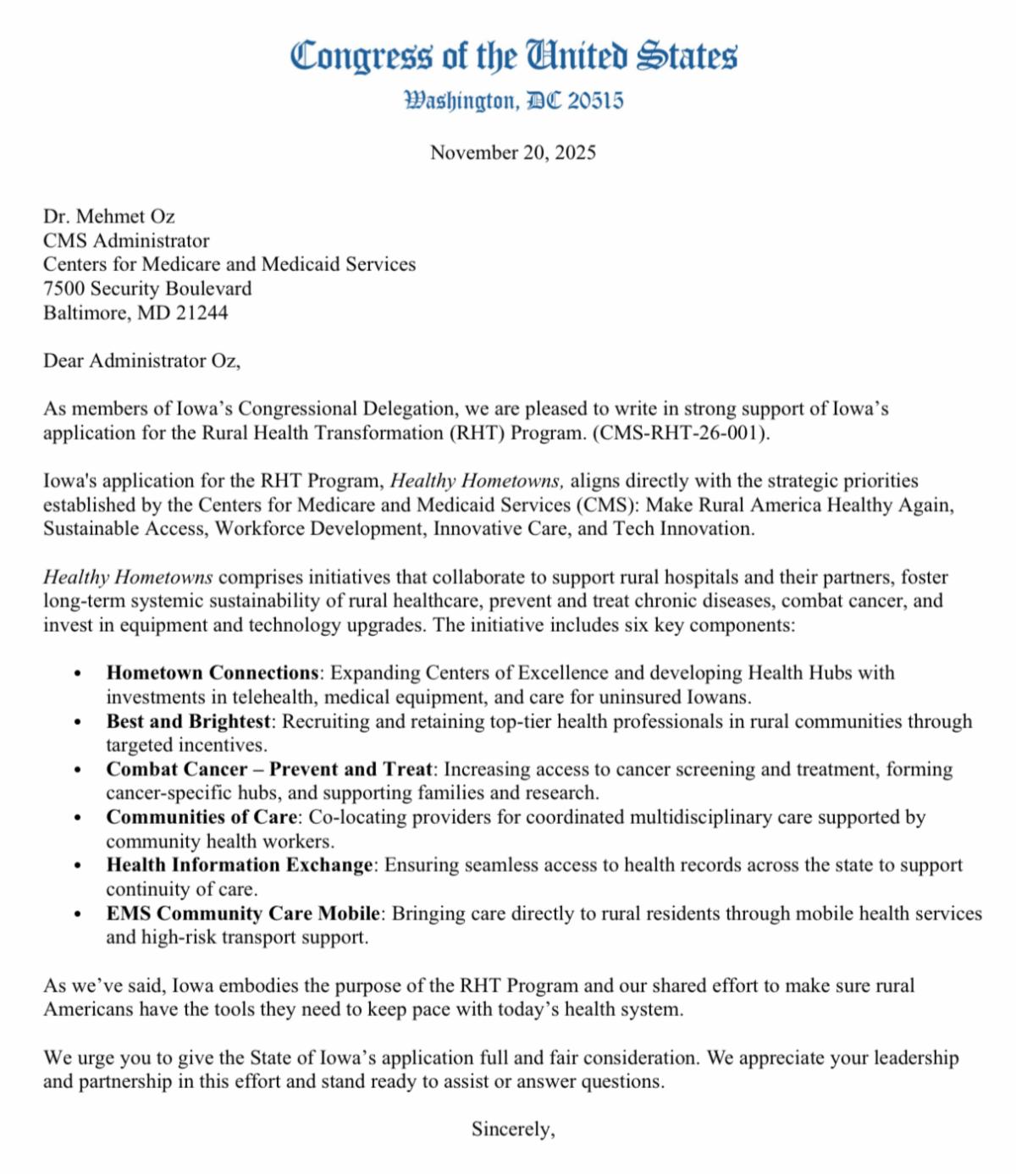 The Rural Health Transformation Program will support Iowa’s Healthy Hometowns initiative to invest in rapid emergency response, help recruit and retain physicians, prevent and treat cancer, and support patients.