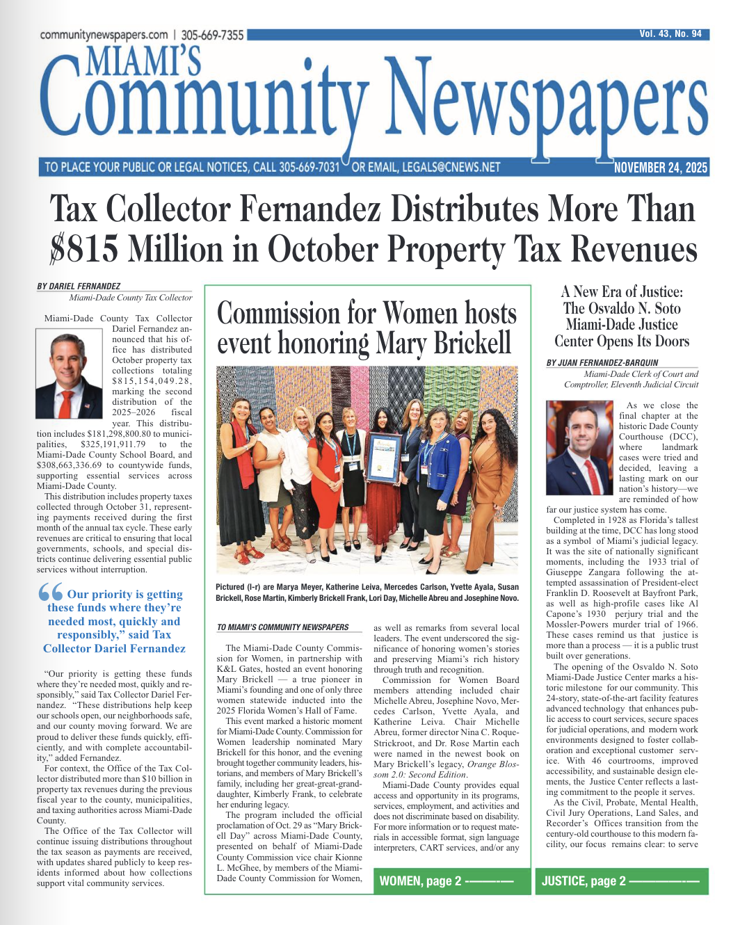 Miami-Dade County Tax Collector Dariel Fernandez announced that his office has distributed October property tax collections totaling $815,154,049.28, marking the second distribution of the 2025–2026 fiscal year. This distribution includes $181,298,800.80 to municipalities, $325,191,911.79 to the Miami-Dade County School Board, and $308,663,336.69 to countywide funds, supporting essential services across Miami-Dade County.