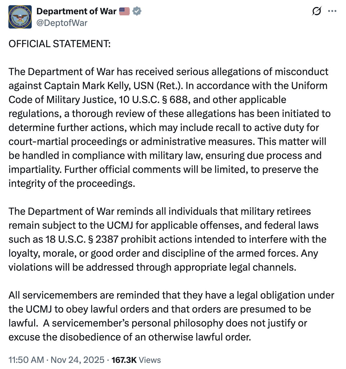 Friends, we’re sharing this important message from Mark Kelly. Earlier this week, Donald Trump called for elected Democrats — including Mark — to be executed. And yesterday, his Department of War announced a formal investigation into Mark.