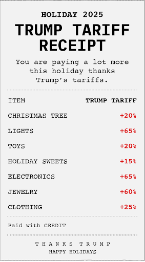 Donald Trump promised voters that he would bring down costs. Of course, he didn't—he actually made the cost of living much higher. Thanks to Trump's tariffs and policies that benefit only the super wealthy, families are paying more for food and gas, toys and clothing, and even Christmas trees!
