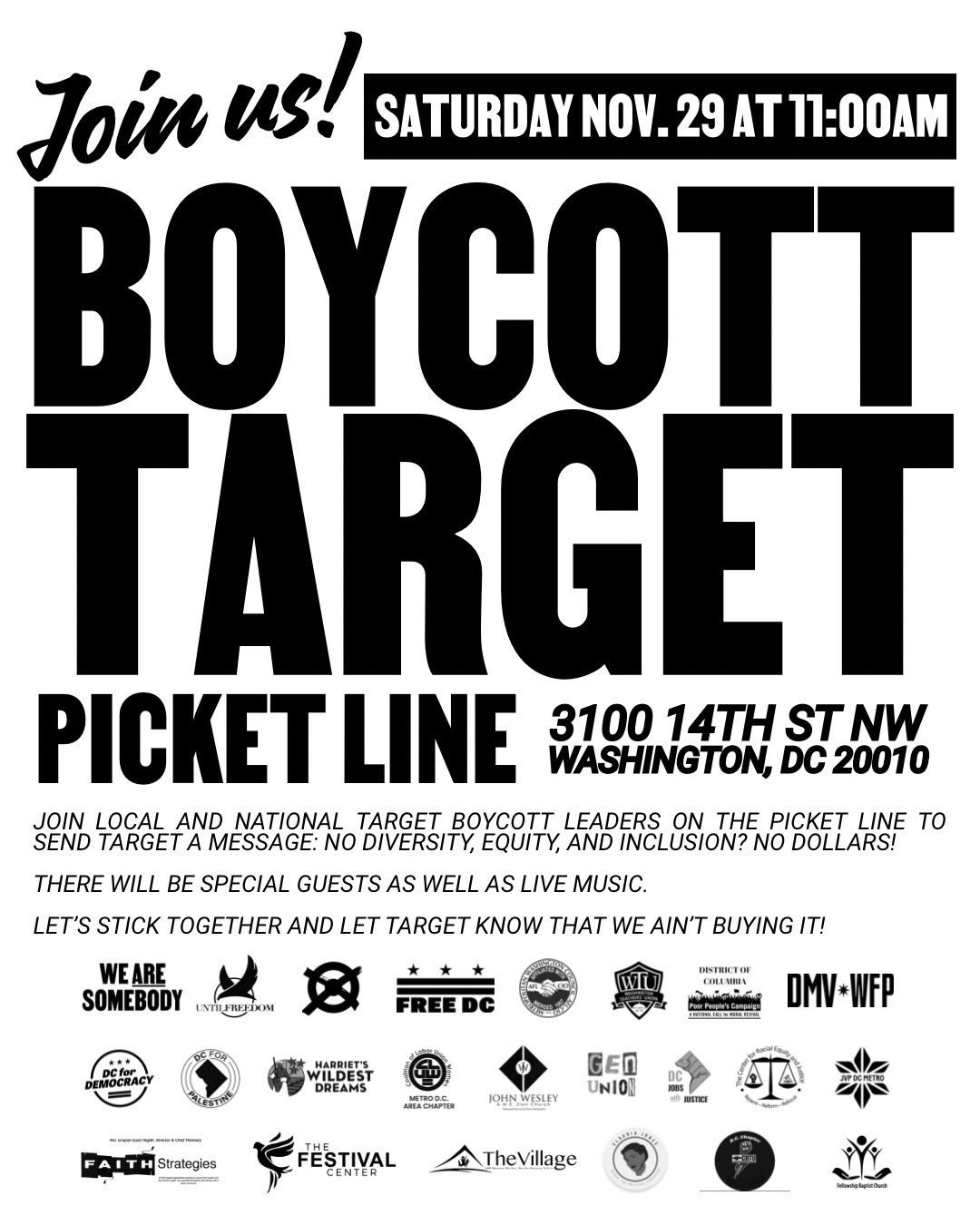 It’s time to tell Trump's allies in the corporate world that we ain't buying it! Join with our allies across labor and community for a solidarity picket with the Boycott Target campaign on Saturday, November 29th at 11 am in front of the Target in Columbia Heights. The event will feature national boycott leaders Sen. Nina Turner, Sen. Tamika Mallory and Rev Jamal Bryant. Bring your own signs and a friend to join you to make it clear #WeAintBuyingIt.