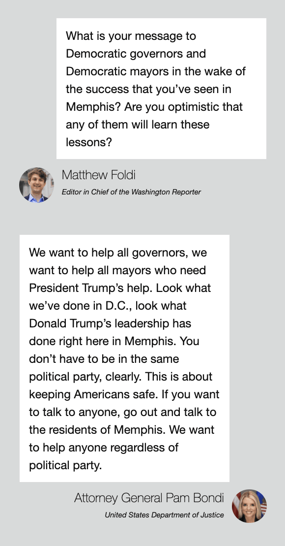 If you have a tip you would like to anonymously submit, please use our tip form — your anonymity is guaranteed! EXCLUSIVE: Attorney General Pam Bondi invites Democratic governors and mayors to partner with the Trump administration on public safetyby Matthew Foldi MEMPHIS, Tenn. — Attorney General Pam Bondi went to Tennessee this week with a simple message: “Make Memphis beautiful again.” Bondi, who went to Memphis to tout the successes of President Donald Trump’s Memphis Safe Task Force, was joined by Sens. Bill Hagerty (R., Tenn.) and Marsha Blackburn (R., Tenn.), Gov. Bill Lee (R., Tenn.), Rep. David Kustoff (R., Tenn.), as well as by Scott Turner, the secretary of Housing and Urban Development (HUD), Gady Serralta, the director of the United States Marshals Service (USMS), Tennessee House Speaker Cameron Sexton, and Tyreece Miller, the U.S. marshal for Tennessee. “In 2024, Memphis had the highest violent crime rate in the country,” Bondi said. “No longer, thanks to the leadership of President Trump and our dedicated men and women in law enforcement.” The Washington Reporter was on site for Bondi’s whirlwind Memphis tour, and asked her what she wanted Democrats to glean from the Trump task force’s success. Heard on the Hill