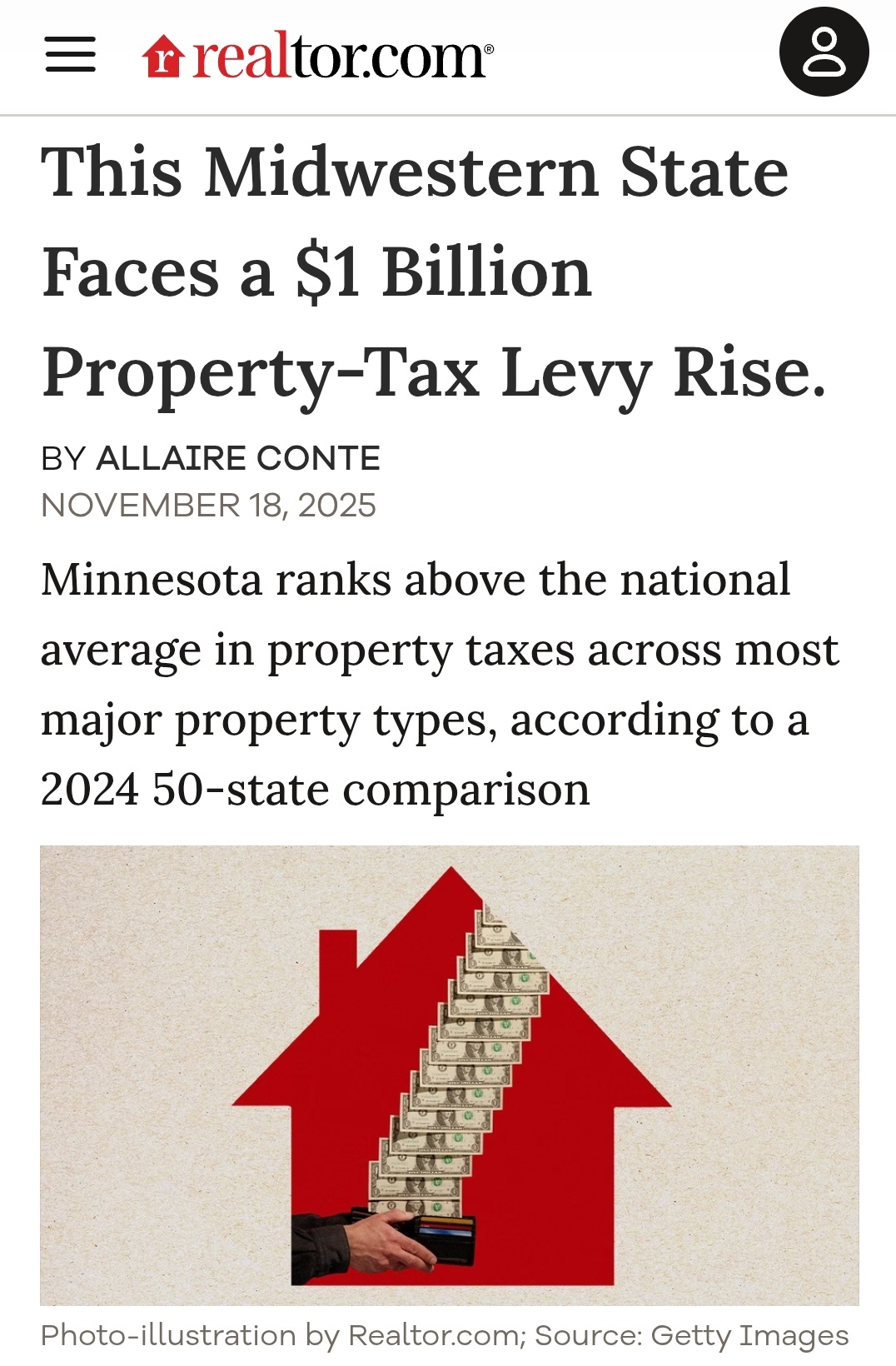 Minnesotans recently began receiving their 2026 proposed property tax statements and many have reached out to me justifiably frustrated over the continued budget-crushing rise in property taxes. The year-over-year sharp increases continue to squeeze Minnesotans making the cost of housing more unaffordable. Those on fixed incomes come closer to losing their home (even if no mortgage) over inability to afford the taxes. Young people aspiring to purchase their first home see the cost growing further distant due to higher monthly payment being out of reach. Even those renting face double-digit increases as the cost of higher property taxes is passed along in higher rent.