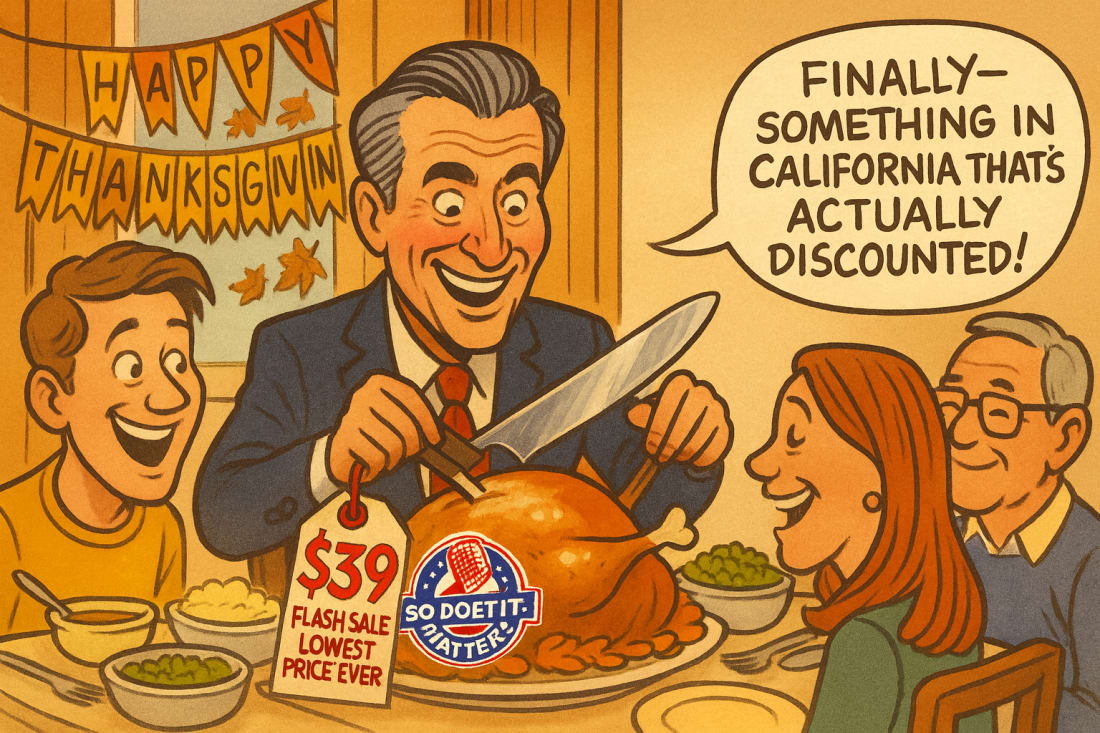 Thanksgiving Flash Sale — $39 for a Full Year of So, Does It Matter?My biggest discount ever — a Thanksgiving thank-you to the thousands of readers who’ve joined this community this year.A (VERY) SHORT VIDEO MESSAGE… $39 THANKSGIVING FLASH SALE — LOWEST PRICE EVERAs we head into Thanksgiving, I want to say how grateful I am for the thousands of you who read So, Does It Matter? every week. Your engagement, your emails, and your willingness to follow California politics with clarity and conviction mean a great deal to me. California lacks many independent conservative voices entirely outside the special-interest ecosystem. I try to call balls and strikes, provide honest analysis, and highlight the issues that actually matter in this state. If you’ve been getting value from that work, this weekend is the best moment of the year to support it. Paid subscribers get: After our successful launch in May, So, Does It Matter? was named a “Bestseller” on Substack in U.S. Politics. Thanksgiving Flash Sale:👉 $39 for a full year (regularly $70) If you’ve been thinking about upgrading, this is the one weekend I would encourage you to do it. It helps sustain the work, deepens your access, and keeps this independent voice strong. Thank you again for reading, sharing, and supporting this project. — Jon You’re currently a free subscriber to So, Does It Matter? California Politics! For the full experience, upgrade your subscription. See how much more you get with an inexpensive, paid subscription, but clicking the button below! Support me in providing hard-hitting, clear-eyed analysis of California politics. I am beholding to no one, and sugar-coat nothing! |