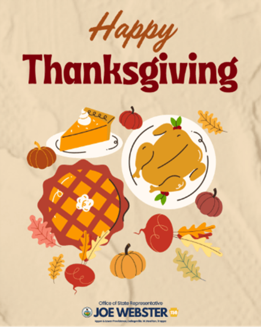 Dear Neighbor, I hope you are well. On behalf of myself and my staff, I want to wish you a Happy Thanksgiving! Below, you'll find information about my district office schedule for the holiday, a reminder about my Winter Collection Drive, a recap from my Veterans’ Breakfast last Thursday and more! As always, I hope you find the information below useful. | Important Updates/Highlights | Happy Thanksgiving, neighbors! I want to wish each of you a wonderful holiday that’s filled with joy and great company! | Hey, neighbors! I want to quickly share my district office hours for the holiday this week. Here are the following dates and times we will be closed. Wednesday, Nov. 26, office closed all day Thursday, Nov. 27, office closed all day Friday, Nov. 28, office closed all day If you need state-related assistance, call my office at (484) 200-8263 and a staff member will get back to you. We will re-open on Monday, Dec. 1 at 9:30 a.m. | Honoring our Veterans with a Breakfast | I want to thank everyone who attended my annual Veterans Breakfast! It was an honor to sit down with fellow veterans, share a meal, and talk about the issues that matter most to them. We discussed specific veteran legislation we’re working on in Harrisburg and shared important resources from Shardae Wescott with the Coatesville VA Medical Center, as well as staff from the Montgomery County Recorder of Deeds. It’s always a privilege to host this event each year for our veteran community, and I’m already looking forward to the next one. A special thank you to Chadwick’s Restaurant & Bar for hosting us, the Schwenksville Color Guard, our national anthem singer, Theresa Shirley, and Risher Van Horn Florist for the rose for our Missing Man Table. | Neighbors, my office is hosting our annual Winter Collection Drive now through December 12. We’re collecting canned foods, winter clothing, toiletries, paper products and more. Please check out the list for some of the most needed items. All donations will be delivered to St. James Outreach House, Daily Bread Community Food Pantry and Spring-Ford Project Outreach. As a reminder, my office will be closed tomorrow, Nov. 26, through Friday, Nov. 28. We will re-open on Monday, Dec. 1 at 9:30 a.m.! You can drop off donations at my office 35 Evansburg Rd, Collegeville, PA 19426. | Inclusive Post-High School Resource Fair | Don't forget! My free Inclusive Post-High School Resource Fair with The Arc Alliance and a team of local volunteers is on Sunday, January 25, from 1 p.m. to 5 p.m. in Hall A of the Greater Philadelphia Expo in Oaks. We are currently seeking vendors for this event and interested parties can apply here. Ideal vendors currently serve high school students with IEPs and 504 plans and offer post‑secondary opportunities such as employment, internships, apprenticeships, transitional services, continuing education, or supported living programs. A comprehensive list can be found below. - Post-Secondary Education: Institutions that offer Higher Education programs for IDD/A