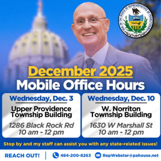 | Heads up, neighbors! The current construction on Ridge Pike is scheduled to continue through Friday, January 2027. During this construction, Ridge Pike will be reduced to a single lane in each direction 24/7 between Germantown Pike and Crosskeys Road. There will also be short-term weekday and nighttime lane closures with detours and flagging. Drivers are advised to plan accordingly and practice safe driving habits while crews are at work. For the latest project updates, please visit PennDOT’s website by clicking here. You can also keep up to date with the project on any of my social media profiles and this weekly newsletter! | | Helpful Information/Other Events | Mobile Office Hours – December | If you’re unable to make it to my district office for state-related assistance, my staff is available for mobile office hours on the first and second Wednesday of each month. Check out our upcoming December schedule below: Wed., December 3 Upper Providence Township Office 10 a.m. - 12 p.m. Wed., December 10 W. Norriton Township Building 10 a.m. - 12 p.m. | If you need state-related assistance, my office can help you! Please feel free to contact my staff with any questions by calling 484-200-8263 or emailing [email protected] | Trappe Tree Lighting from Historic Trappe Wednesday, December 3, from 6:30 p.m. - 7:30 p.m. The Speaker’s House – 151 W. Main Street, Trappe, PA Pet Photos with Santa from Lower Providence Township Thursday, December 4, from 6 p.m. - 8 p.m. Eagleville Park (Bocce Courts) – 100 Parklane Drive, Eagleville, PA Full Moon Hike at Norristown Farm Park Friday, December 5, at 4:40 p.m. Norristown Farm Park, 2500 Upper Farm Road, Norristown, PA 17th Annual Community Tree Lighting from Lower Providence Township Friday, December 5, at 6:30 p.m. Eagleville Park – 100 Parklane Drive, Eagleville, PA Holidays are for the Birds! Workshop from John James Audubon Center at Mill Grove Saturday, December 6, from 11 a.m. - 1 p.m. John James Audubon Center – 1201 Pawlings Road Audubon, PA 6th Annual Tree Lighting Ceremony from West Norriton Township Saturday, December 6, at 6 p.m. 1630 W. Marshall St, Norristown, PA Note: Donations will be accepted for Jefferson Fire Co’s Toys 4 Kids Blizzard Bash Open House from Upper Providence Township Friday, December 12, from 5:30 p.m. - 7 p.m. Upper Providence Community Center – 499 Hopwood Rd, Collegeville, PA Note: Registration required here | Please continue to stay safe, healthy, and well-informed. And, if you have questions about any state-related issue, please contact my office at 484-200-8263 or email [email protected]. If you wish to unsubscribe to this email, please scroll to the bottom where it says, “Update Email Preferences.” Sincerely, Rep. Joe Webster State Representative 150th Legislative District | District Office 35 Evansburg Road Collegeville, PA 19426 (484) 200-8263 | Pennsylvania State Capitol 125-B East Wing P.O. Box 202150 Harrisburg, PA 17120 (717) 787-0419 | |