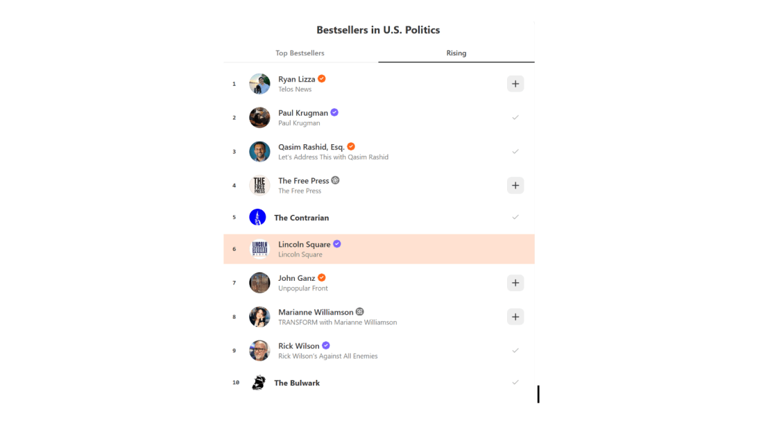Why is this happening? Because democracy depends on informed citizens. And your subscription upgrade helps us inform them. But we can’t do it alone. For every annual subscription sold, we can reach 10,000 Americans across Social Media with the facts on how Trump administration policies will affect our lives and our future—and with this information, we are growing the resistance movement that will stand up against this assault on our Constitution. Can we count on you to upgrade today? This is our lowest rate of the year and it ends today. …and for today only, we’re offering you 50% off an annual subscription for one year—that’s only $50 a year—l. You can support the work of independent media and help build a robust pro-democracy media machine for less than a price of a burger! But hurry! This offer ends TODAY. You can cancel at any time. We’re letting Americans know what’s happening with the corruption within the Trump administration, the grifts, the national security risks, the economy, the threat to voting rights, and all the issues important to them and their families. Why? When Americans are informed, they rise up! We’re honored to extend this 50% off annual membership offer to you in hopes that you’ll upgrade your subscription and become a paid member. Get access to our members-only show, or community chat, Strategy Session LIVE, Q&As with our strategists, and exclusive invites to our live, virtual events, including our exclusive, paid subscriber-only 2025 year-end events that include some of your favorite voices in politics. Plus, you’ll get 20% off in our pro-democracy store and $20 in Lincoln bucks every month to spend in the Lincoln Square store Can we count on you to join our paid community, the Lincoln Loyal? Stand for truth. Defend democracy. Support independent media. Upgrade today. Thank you and Happy Thanksgiving, PS: …and thanks to our paid subscribers we are once again, ranked in the top 10 Rising Political Substack communities: Join us! |