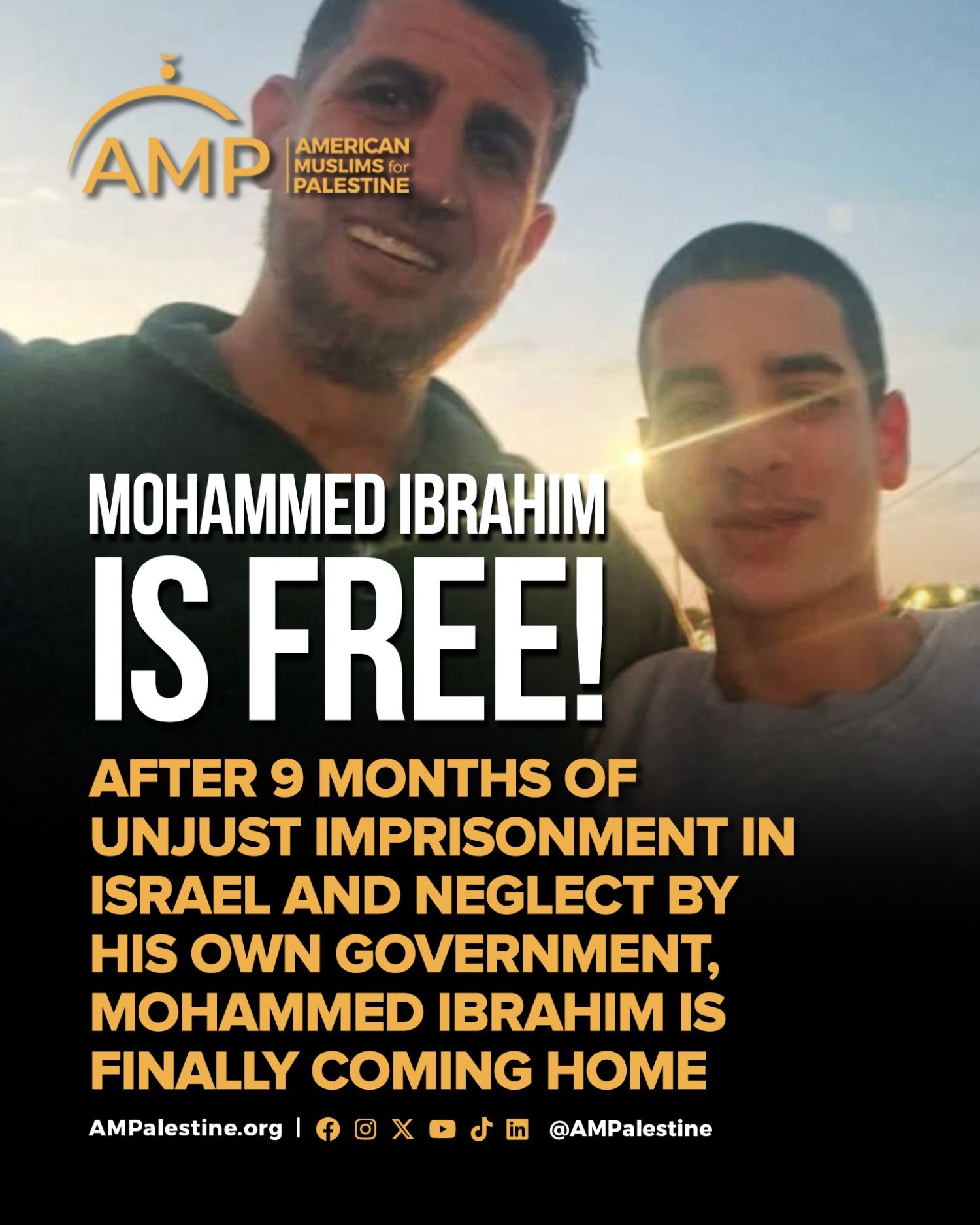 After 9 months of unjust imprisonment in Israel and neglect by his own government, Mohammed Ibrahim is finally coming home [WASHINGTON D.C., NOVEMBER 27, 2025] — Nine months ago, more than 30 Israeli occupation soldiers stormed the Ibrahim family’s home in the West Bank in the dead of night and tore Mohammed Ibrahim, only 15 years old at the time, away from his family. Today, November 27, 2025, we are relieved and overjoyed to share the news of his release. We send our deepest congratulations to Mohammed’s family. After months of fear, uncertainty, and waiting, he is finally going home to his mom and dad. Mohammed is a Palestinian-American child from Florida. He should have been protected by his government, but instead, he was abandoned. The U.S. government let a 15-year-old, now 16, American citizen languish in an Israeli prison for nine months before lifting a finger. Mohammed’s freedom came after sustained, unrelenting pressure from grassroots organizers, advocates, and communities across the country, including the efforts of AMP’s 501(c)(4) affiliate organization, Americans for Justice in Palestine Action (AJP Action), which was the first to bring Mohammed’s case to light back in July of this year and to launch a campaign demanding his release. His release is a reminder that persistent, collective action makes a difference, even when the odds feel stacked against us. During his time in Israeli prison, Mohammed endured systemic abuse at the hands of the apartheid state. He lost more than half his weight, was beaten by soldiers, held in solitary confinement, and even contracted scabies because of the prison’s inhumane conditions. Israeli authorities also barred Mohammed from any contact with his family. He wasn’t allowed a single phone call, nor were his parents allowed to visit him. For months, the only information his loved ones had came through U.S. officials who were given limited access to him. No child deserves this kind of treatment. Mohammed’s family is now focused on getting him the urgent medical care he needs after months of surviving such inhumane conditions. Our hope, alongside his family’s, is that his health is fully restored and that he’s given the chance to step back into his childhood, something that was violently taken from him over the last nine months. Mohammed’s release is the bare minimum, as he should never have been detained in the first place. And while we’re relieved he’s finally free, his freedom does not account to justice. As Mohammed and his family begin to heal from this trauma, we remain steadfast in our commitment to fight for real accountability. We will continue pushing for justice for Mohammed, for his cousin Sayfollah, who was killed by Israeli settlers over the summer, and for every Palestinian child being held as a political prisoner. Mohammed and his family’s experience is just one of hundreds. As of June 30 of this year, at least 360 Palestinian children were being held in administrative detention by Israel, nearly half of them without any charge or trial. Israel remains the only state in the world that prosecutes children in military courts. If anything, Mohammed’s case simply exposed, yet again, the scale of Israel’s abuses against Palestinian children. We are unwavering in our commitment to fight back. Everyone responsible, from the Israeli government to the U.S. administration that neglected this family and waited nine months before applying enough pressure to secure his release, must be held accountable. In solidarity, American Muslims for Palestine (AMP) |
