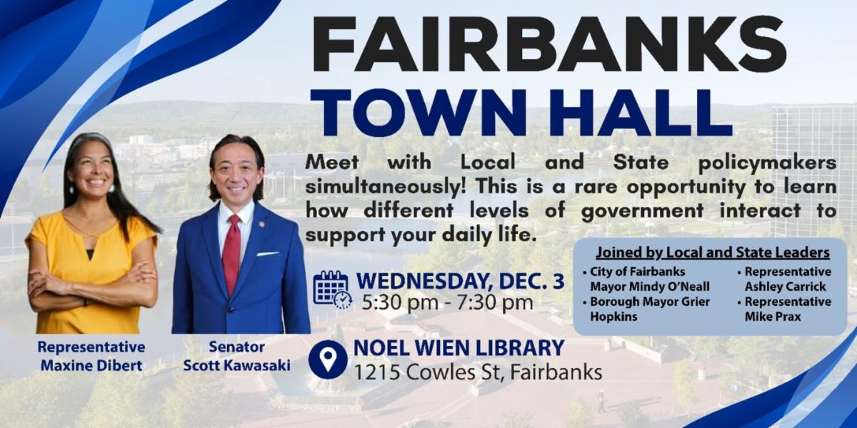 As the legislative session approaches, I am excited to announce a Town Hall on Wednesday, December 3rd, at the Noel Wien Library Auditorium from 5:30 pm to 7:30 pm.