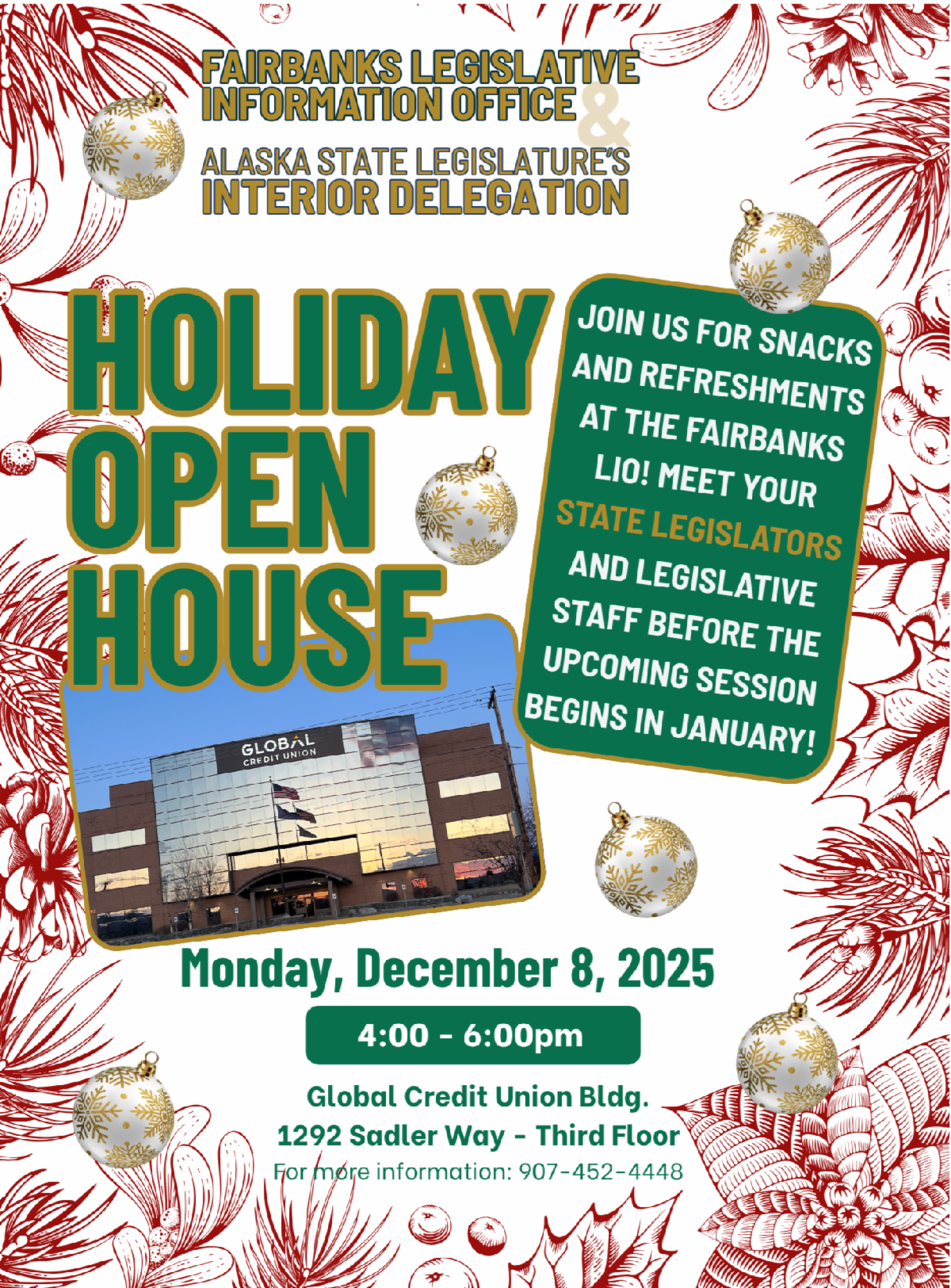 The Fairbanks Legislative Information Office (LIO) is hosting its annual Holiday Open House on December 8th from 4:00–6:00 pm! The event will take place on the third floor of the Global Credit Union building near Home Depot and everyone is welcome to stop by.