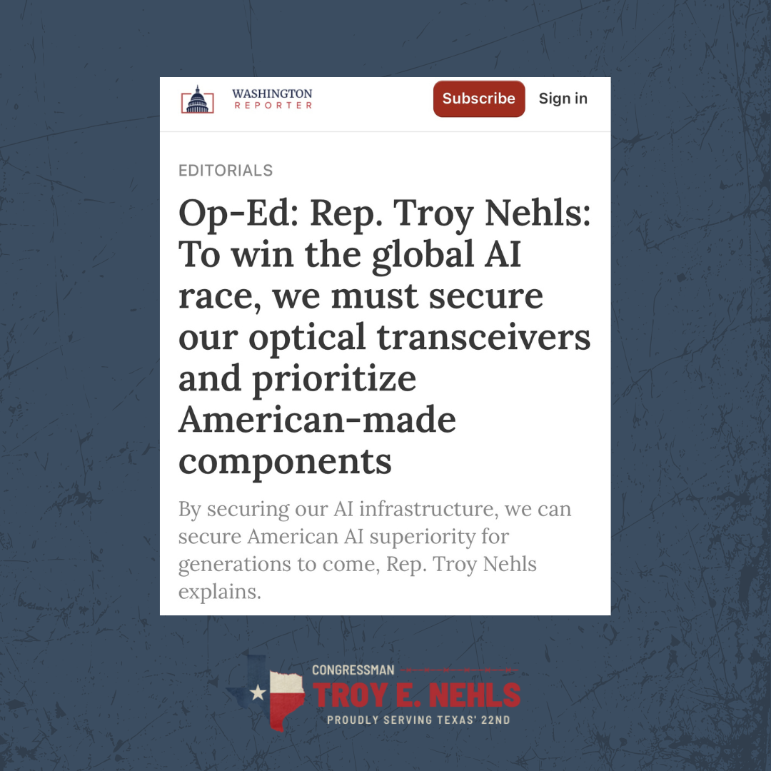 This week, I penned an op-ed in the Washington Reporter discussing the importance of protecting our nation's artificial intelligence (AI) infrastructure to secure American AI superiority for generations to come.