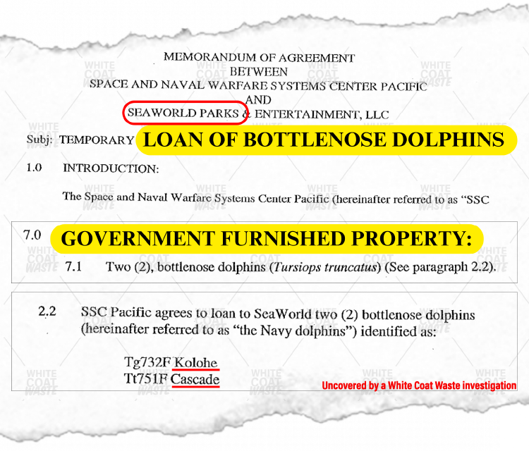 We’ve obtained hard evidence that the Navy acquired animals from the infamous amusement park disgraced by the Blackfish scandal, and sent others there to breed even more marine mammals into a life of taxpayer-funded experimentation.
