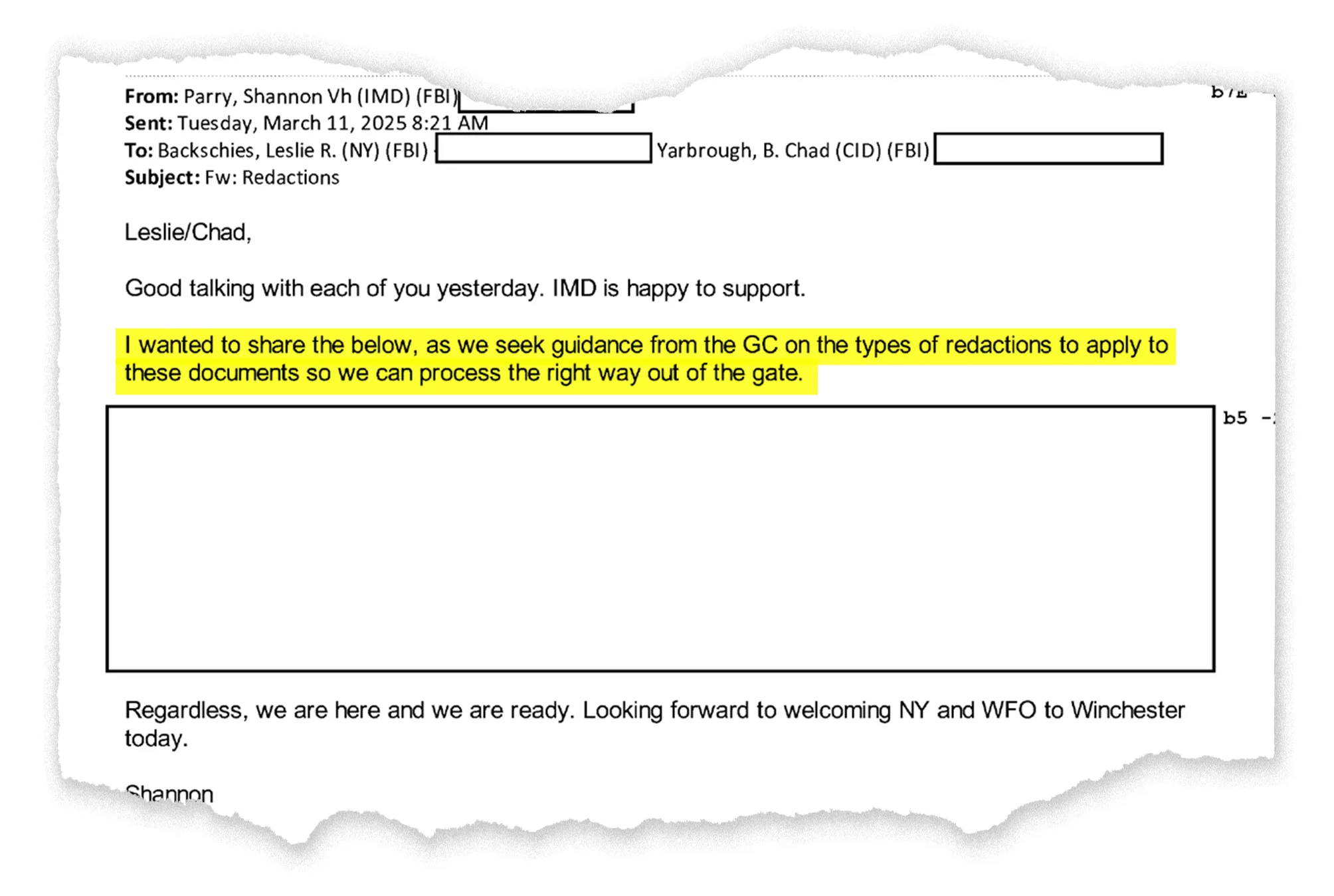 On March 24, an email sent to FBI personnel said “Phase 1 redactions are complete” and “Phase 2” was being prepared for “final delivery to DOJ.”