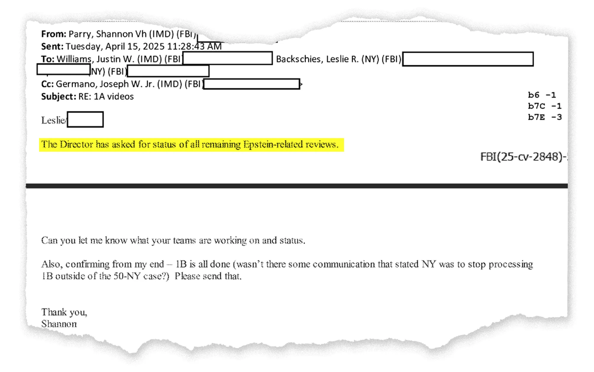 That same day, Parry sent an email to other FBI personnel that said Patel “asked for status of all remaining Epstein-related reviews.”