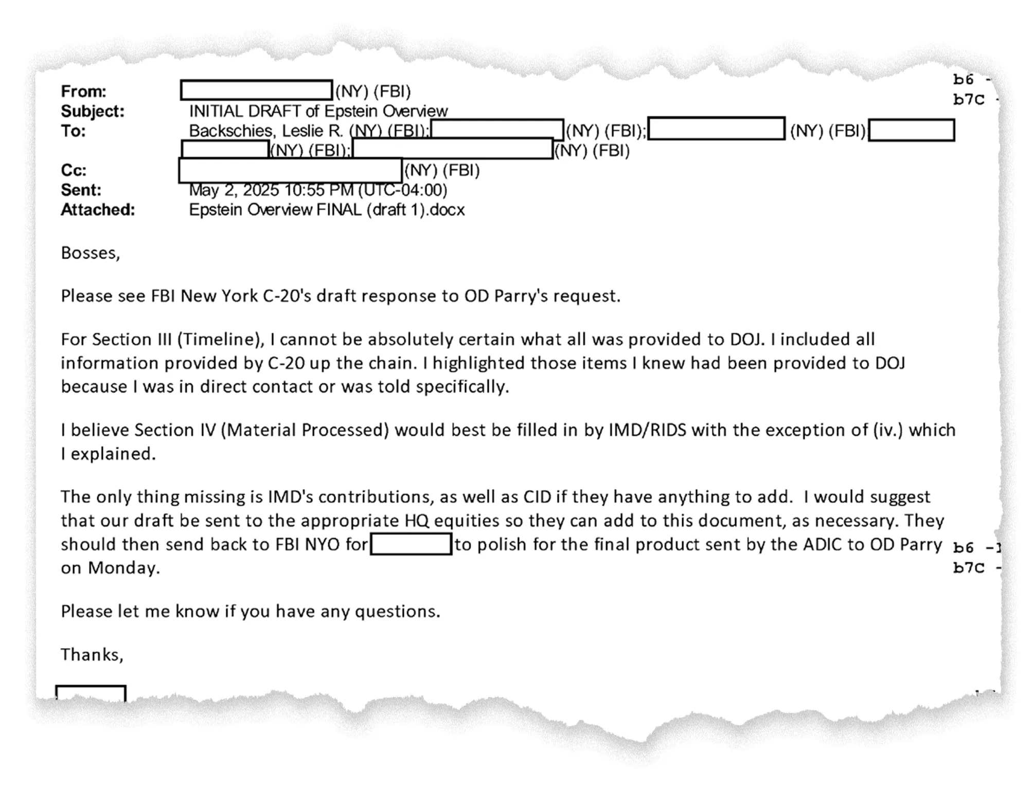 On May 2, an FBI employee from the New York field office sent an email and attached a document titled, “Epstein Overview FINAL” that summarized their work. The FBI withheld a copy of the attachment.