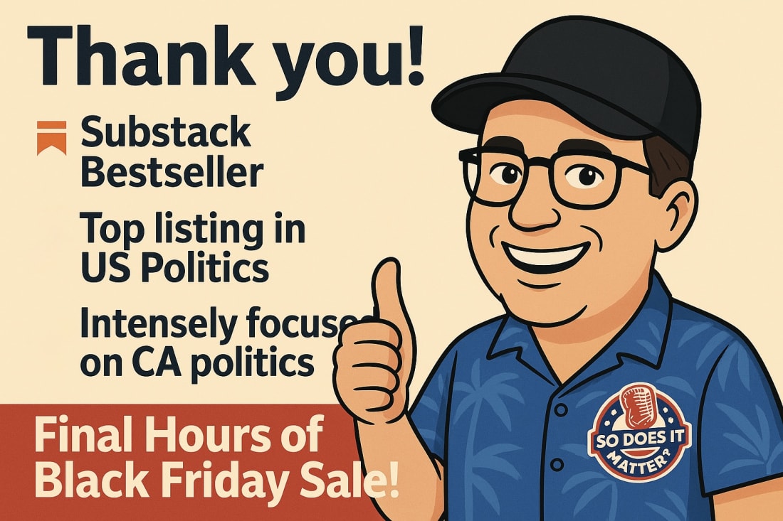 Final Reminder: Sale Ends In 3 Hours — $39/Annual Subscription45% off. This will be the lowest price available this year. Ends at 11:59 p.m. tonight!Thank you for being a part of So, Does It Matter? We are heading into an intense election year and an upgrade now will unlock the roughly 40% of our content that is behind the paywall for the entire election season — for $3.25 a month! Oh yes, this greatly supports my efforts and allows me to do even more! Yeah, I wasn’t going to send one more reminder. But based on my in-box, everyone is doing this. But none of them offering a front row seat to California politics, with someone you know is a straight-shooter who will call balls and strikes! Please upgrade! Jon You’re currently a free subscriber to So, Does It Matter? California Politics! For the full experience, upgrade your subscription. See how much more you get with an inexpensive, paid subscription, but clicking the button below! Support me in providing hard-hitting, clear-eyed analysis of California politics. I am beholding to no one, and sugar-coat nothing! |