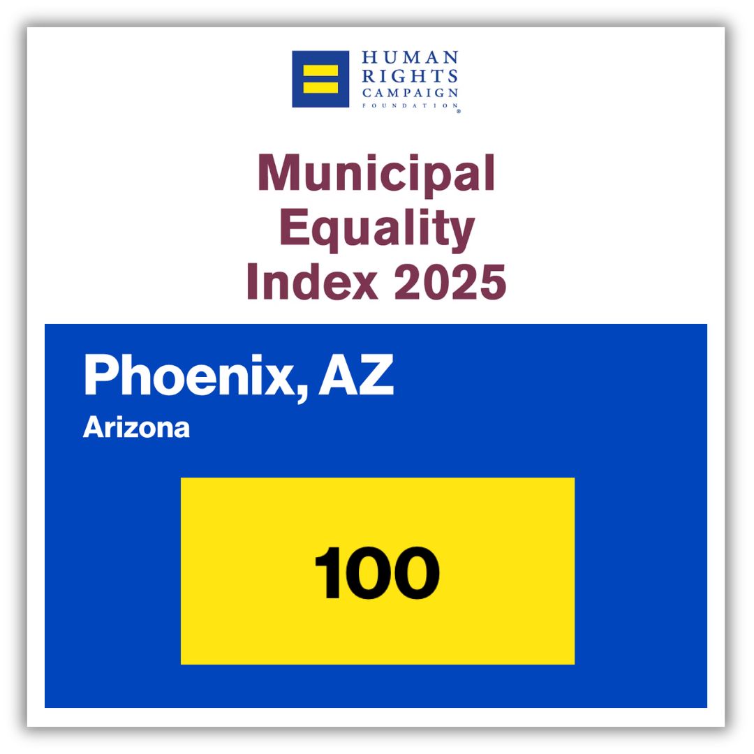 For the 13th consecutive year, Phoenix earned a perfect 100 on the Human Rights Campaign’s Municipal Equality Index (MEI). The MEI examines municipal laws, policies, and services to assess their inclusivity for local LGBTQ residents and employees. Here in Phoenix, everyone is welcome, protected, and empowered to be the best version of themselves. |