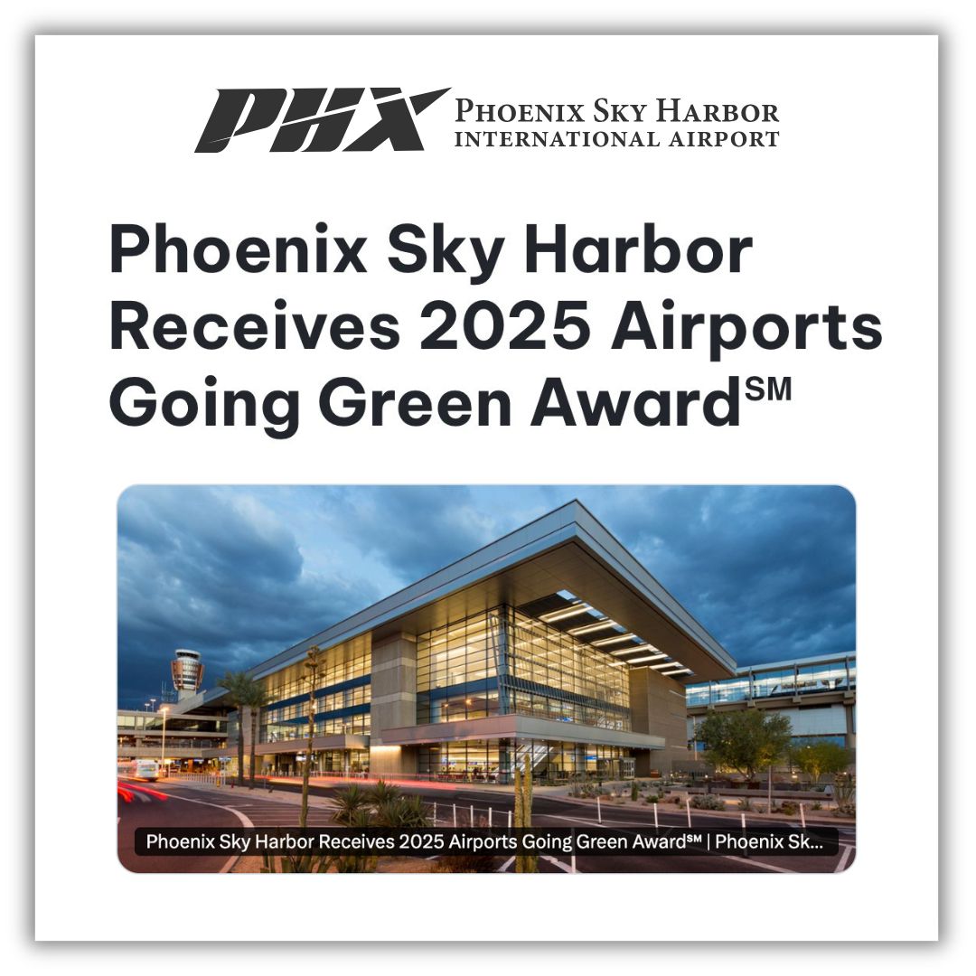 Building upon Phoenix’s positive climate record, Phoenix Sky Harbor Airport was recently awarded the 2025 Airports Going Green Award for the PHX Green Business Partner Program. This award recognizes the airport's efforts in innovation and leadership in aviation sustainability. Not only is Phoenix Sky Harbor America’s Friendliest Airport, it’s also one of its most environmentally innovative. |
