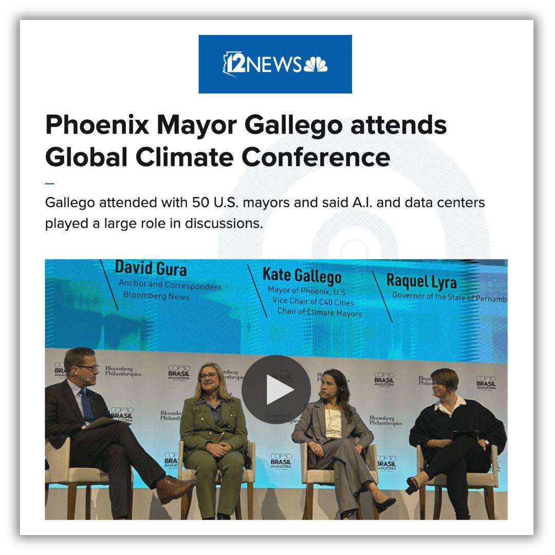 Mayor Kate Gallego recently attended the 2025 United Nations Climate Change Conference, alongside 35 other U.S. mayors, to discuss reducing greenhouse gas emissions and promoting sustainable development. As the current chair of the Climate Mayors, Kate brought critical experience to the conference and led discussions on how to develop sustainable solutions, particularly with the rise of AI and new data centers.