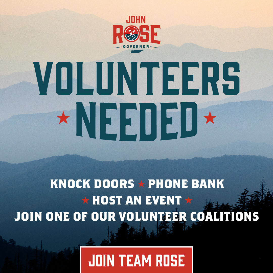 Supporters like you are the heart of this movement. If we’re going to elect John as the next Governor of Tennessee, we need a powerful grassroots team standing with us in every county, every community, and every neighborhood. From knocking doors and making calls to helping at events or spreading the word online—there’s a place for everyone on Team Rose. This campaign wins when Tennesseans step up. Click the button below to sign up to be a Team Rose volunteer! |