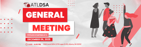 Attend Atlanta DSA's monthly General Meeting on Saturday, December 6, at 2PM, at CWA Local 3204 (279 Logan St SE)! We will hear the latest from our chapter's campaigns and committees, discuss current events in the chapter, and debate and vote on resolutions. All members are encouraged to attend, and interested non-members are welcome!